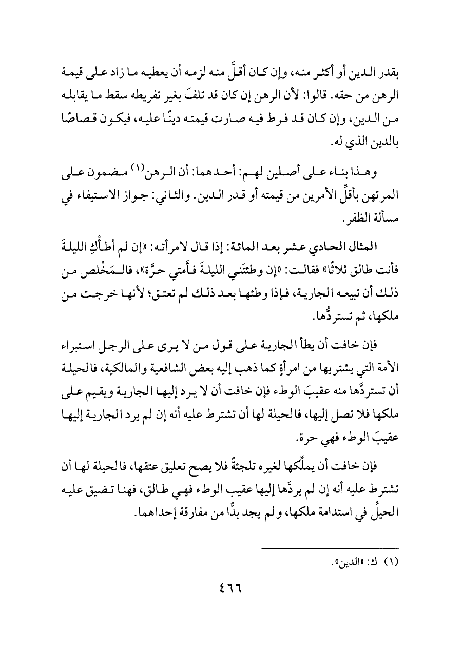 المثال الحادي عشر بعد المائة: إذا قال لامرأته: «إن لم أطأْكِ الليلةَ فأنت طالق ثلاثًا» فقالت: «إن وطئتَني الليلةَ فأَمتي حرَّة»، فالمَخْلص من ذلك أن تبيعه الجارية، فإذا وطئها بعد ذلك لم تعتق؛ لأنها خرجت من ملكها، ثم تستردُّها.