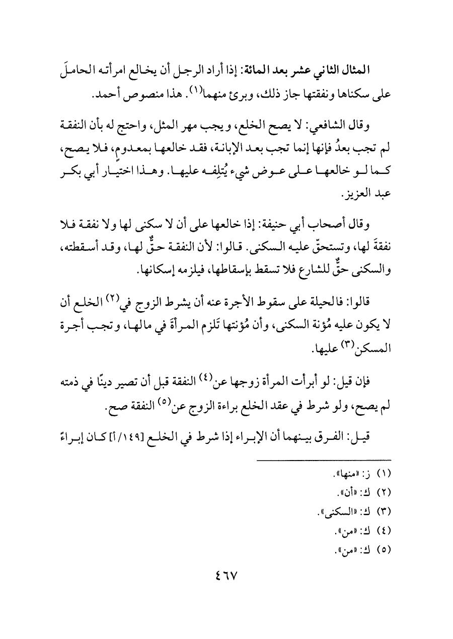 المثال الثاني عشر بعد المائة: إذا أراد الرجل أن يخالع امرأته الحاملَ على سكناها ونفقتها جاز ذلك، وبرئ منهما (¬١). هذا منصوص أحمد.