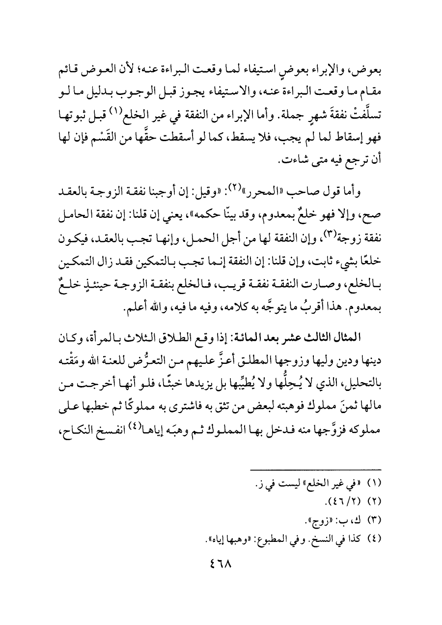 وأما قول صاحب «المحرر» (¬٢): «وقيل: إن أوجبنا نفقة الزوجة بالعقد صح، وإلا فهو خلعٌ بمعدوم، وقد بينّا حكمه»، يعني إن قلنا: إن نفقة الحامل نفقة زوجة (¬٣)، وإن النفقة لها من أجل الحمل، وإنها تجب بالعقد، فيكون خلعًا بشيء ثابت، وإن قلنا: إن النفقة إنما تجب بالتمكين فقد زال التمكين بالخلع، وصارت النفقة نفقة قريب، فالخلع بنفقة الزوجة حينئذٍ خلعٌ بمعدوم. هذا أقربُ ما يتوجَّه به كلامه، وفيه ما فيه، والله أعلم.