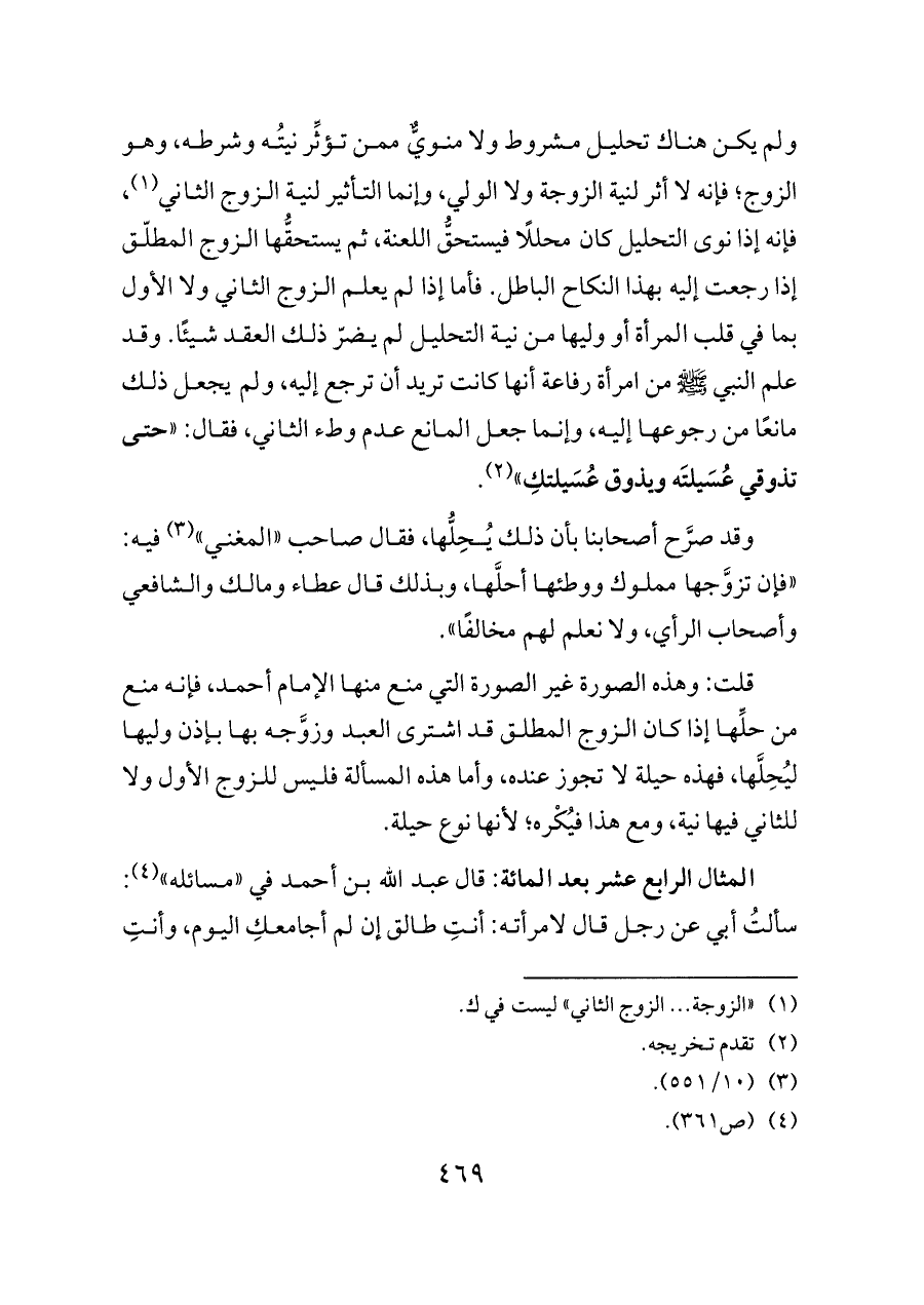 قلت: وهذه الصورة غير الصورة التي منع منها الإمام أحمد، فإنه منع من حلِّها إذا كان الزوج المطلق قد اشترى العبد وزوَّجه بها بإذن وليها ليُحِلَّها، فهذه حيلة لا تجوز عنده، وأما هذه المسألة فليس للزوج الأول ولا للثاني فيها نية، ومع هذا فيُكْره؛ لأنها نوع حيلة.