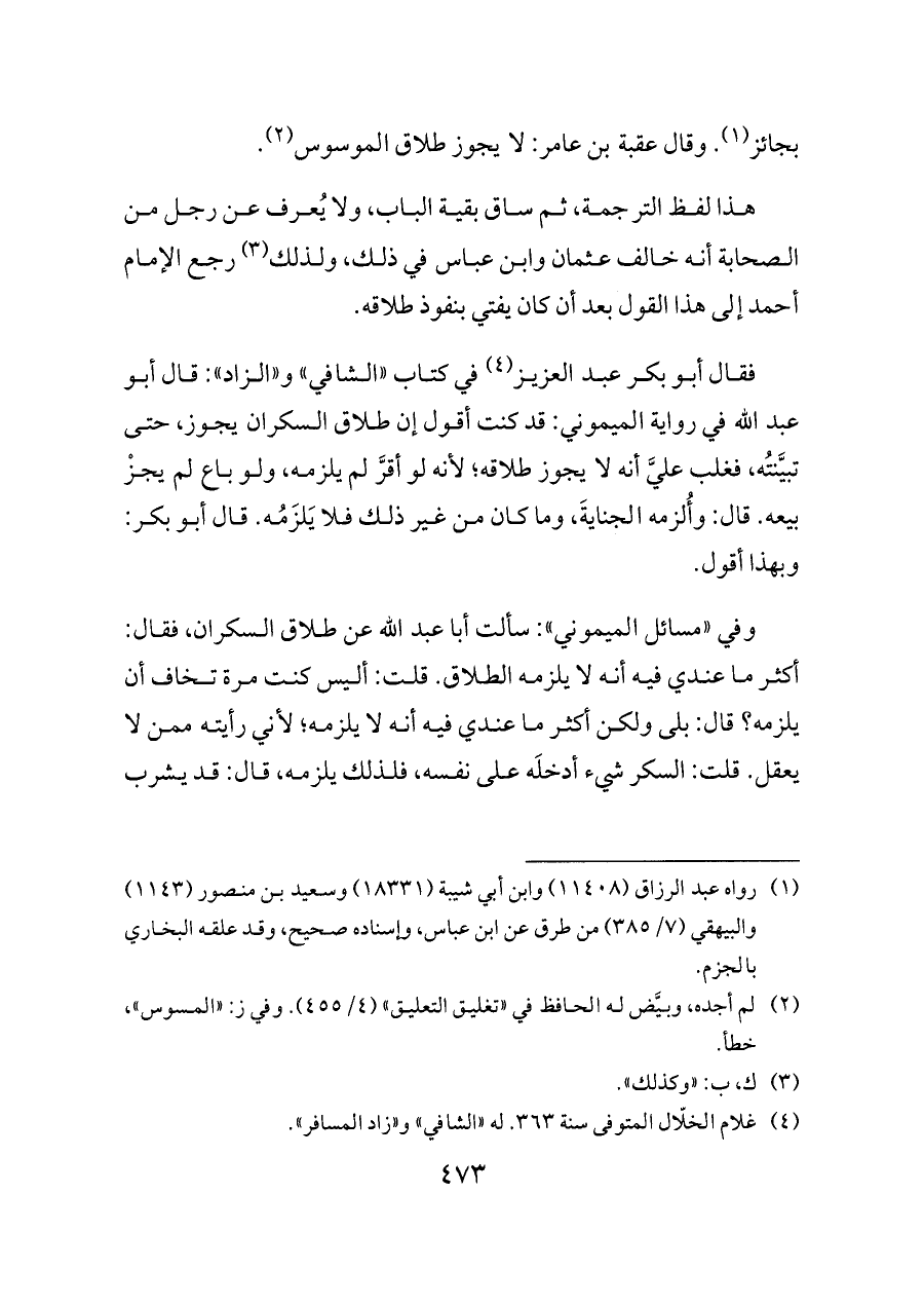 فقال أبو بكر عبد العزيز (¬٤) في كتاب «الشافي» و «الزاد»: قال أبو عبد الله في رواية الميموني: قد كنت أقول إن طلاق السكران يجوز، حتى تبيَّنتُه، فغلب عليَّ أنه لا يجوز طلاقه؛ لأنه لو أقرَّ لم يلزمه، ولو باع لم يجزْ بيعه. قال: وأُلزمه الجنايةَ، وما كان من غير ذلك فلا يَلزَمُه. قال أبو بكر: وبهذا أقول.