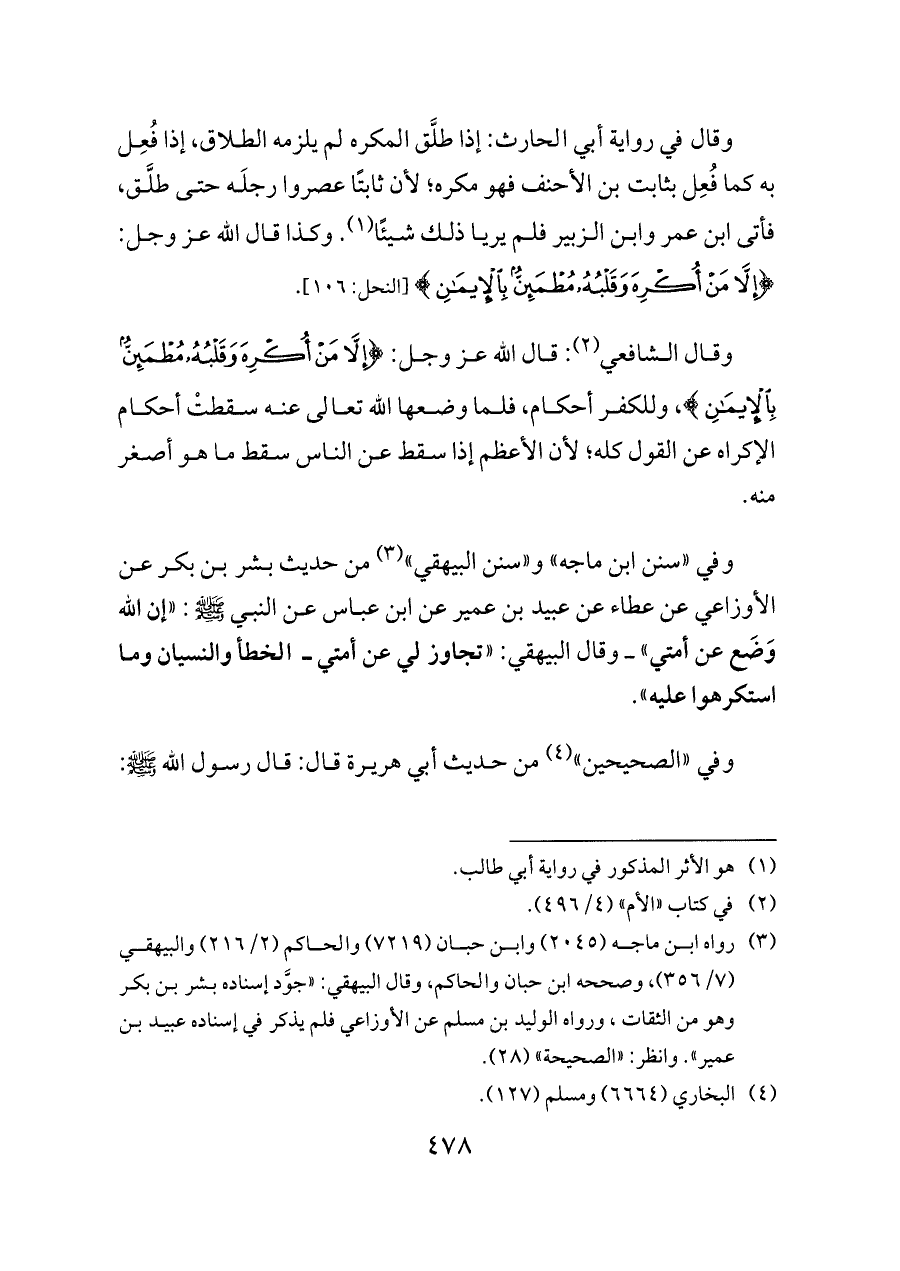 وفي «سنن ابن ماجه» و «سنن البيهقي» (¬٣) من حديث بشر بن بكر عن الأوزاعي عن عطاء عن عبيد بن عمير عن ابن عباس عن النبي - صلى الله عليه وسلم -: «إن الله وَضَع عن أمتي» ــ وقال البيهقي: «تجاوز لي عن أمتي ــ الخطأ والنسيان وما استكرهوا عليه».