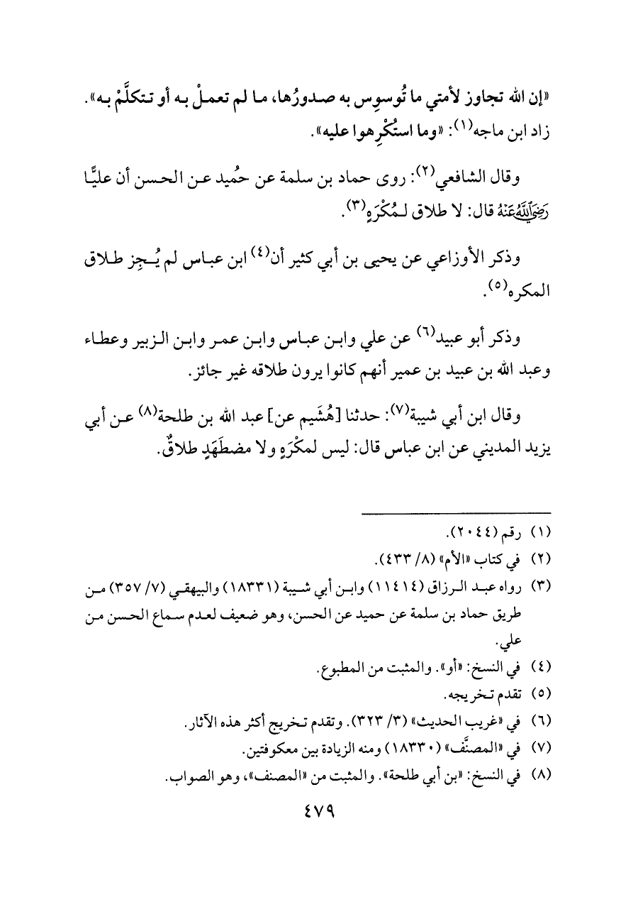 «إن الله تجاوز لأمتي ما تُوسوِس به صدورُها، ما لم تعملْ به أو تتكلَّمْ به». زاد ابن ماجه (¬١): «وما استُكْرِهوا عليه».
