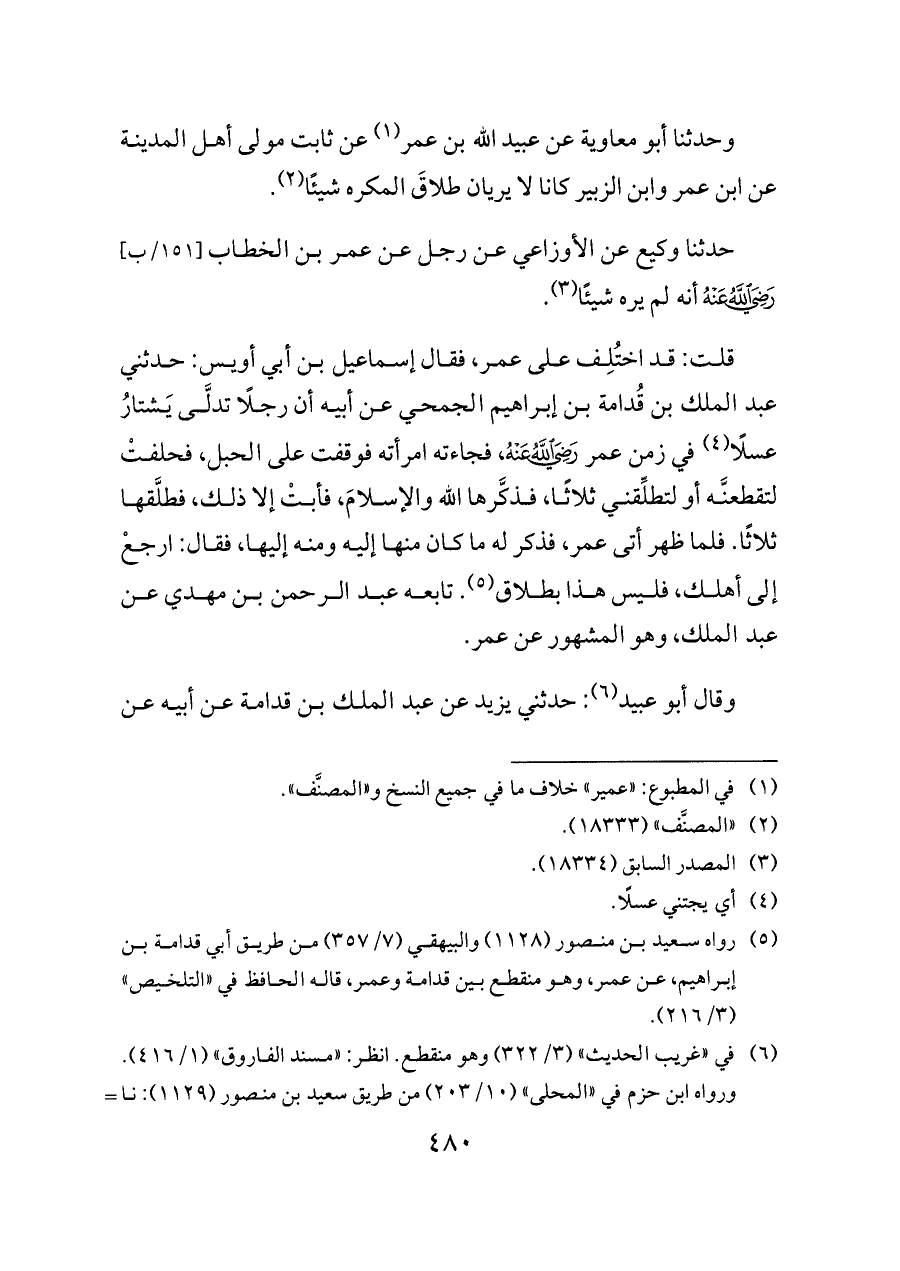 (¬٦) في «غريب الحديث» (٣/ ٣٢٢) وهو منقطع. انظر: «مسند الفاروق» (١/ ٤١٦). ورواه ابن حزم في «المحلى» (١٠/ ٢٠٣) من طريق سعيد بن منصور (١١٢٩): نا فرج بن فضالة حدثني عمرو بن شراحيل المعافري أن امرأة سلَّتْ سيفًا فوضعته على بطن زوجها وقالت: والله لأنفذنك أو لتطلقني، فطلقها ثلاثًا، فرفع ذلك إلى عمر بن الخطاب، فشتمها وسألها عما حملها عليه، فقالت: بُغضي إياه، فأمضى طلاقها. وهو منقطع أيضًا. وضعَّف ابن حزم (٨/ ٣٣٢) إمضاء طلاق المكره عن عمر.