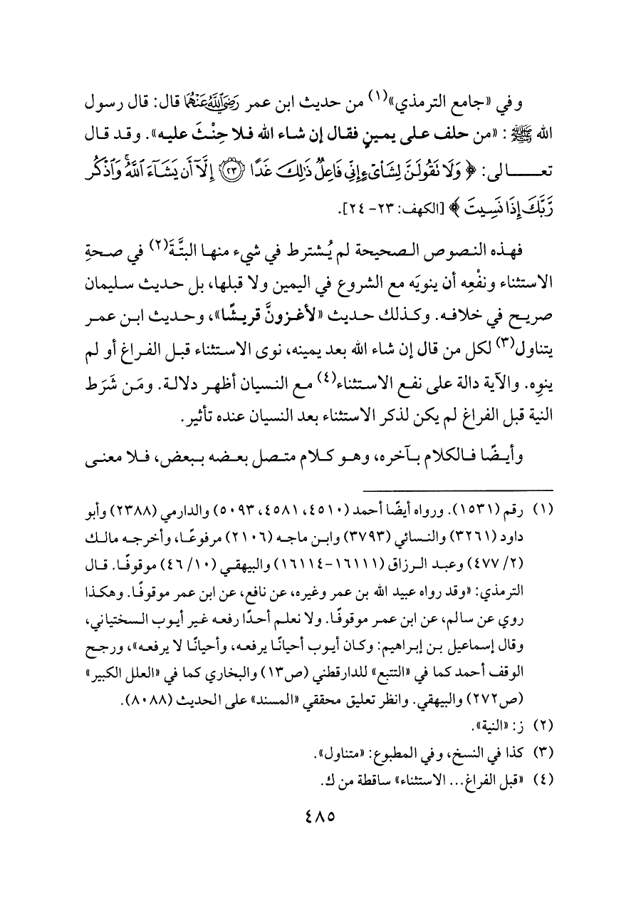 وفي «جامع الترمذي» (¬١) من حديث ابن عمر - رضي الله عنهما - قال: قال رسول الله - صلى الله عليه وسلم -: «من حلف على يمينٍ فقال إن شاء الله فلا حِنْثَ عليه». وقد قال تعالى: {وَلَا تَقُولَنَّ لِشَيْءٍ إِنِّي فَاعِلٌ ذَلِكَ غَدًا (٢٣) إِلَّا أَنْ يَشَاءَ اللَّهُ وَاذْكُرْ رَبَّكَ إِذَا نَسِيتَ} [الكهف: ٢٣ - ٢٤].