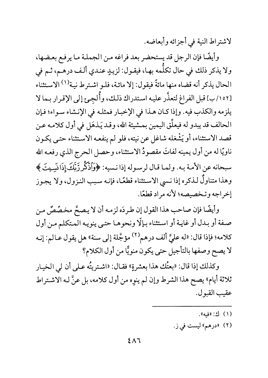 وأيضًا فإن الرجل قد يستحضر بعد فراغه من الجملة ما يرفع بعضها، ولا يذكر ذلك في حال تكلُّمه بها، فيقول: لزيدٍ عندي ألف درهم، ثم في الحال يذكر أنه قضاه منها مائةً فيقول: إلا مائة، فلو اشترط نية (¬١) الاستثناء [١٥٢/ب] قبل الفراغ لتعذَّر عليه استدراك ذلك، وأُلجِئ إلى الإقرار بما لا يلزمه والكذب فيه. وإذا كان هذا في الإخبار فمثله في الإنشاء سواء؛ فإن الحالف قد يبدو له فيعلِّق اليمين بمشيئة الله، وقد يَذهَل في أول كلامه عن قصد الاستثناء، أو يَشْغله شاغل عن نيته، فلو لم ينفعه الاستثناء حتى يكون ناويًا له من أول يمينه لفاتَ مقصودُ الاستثناء، وحصل الحرج الذي رفعه الله سبحانه عن الأمة به. ولما قال لرسوله إذا نسيه: {وَاذْكُرْ رَبَّكَ إِذَا نَسِيتَ} وهذا متناولٌ لذكره إذا نسي الاستثناء قطعًا، فإنه سبب النزول، ولا يجوز إخراجه وتخصيصه؛ لأنه مراد قطعًا.