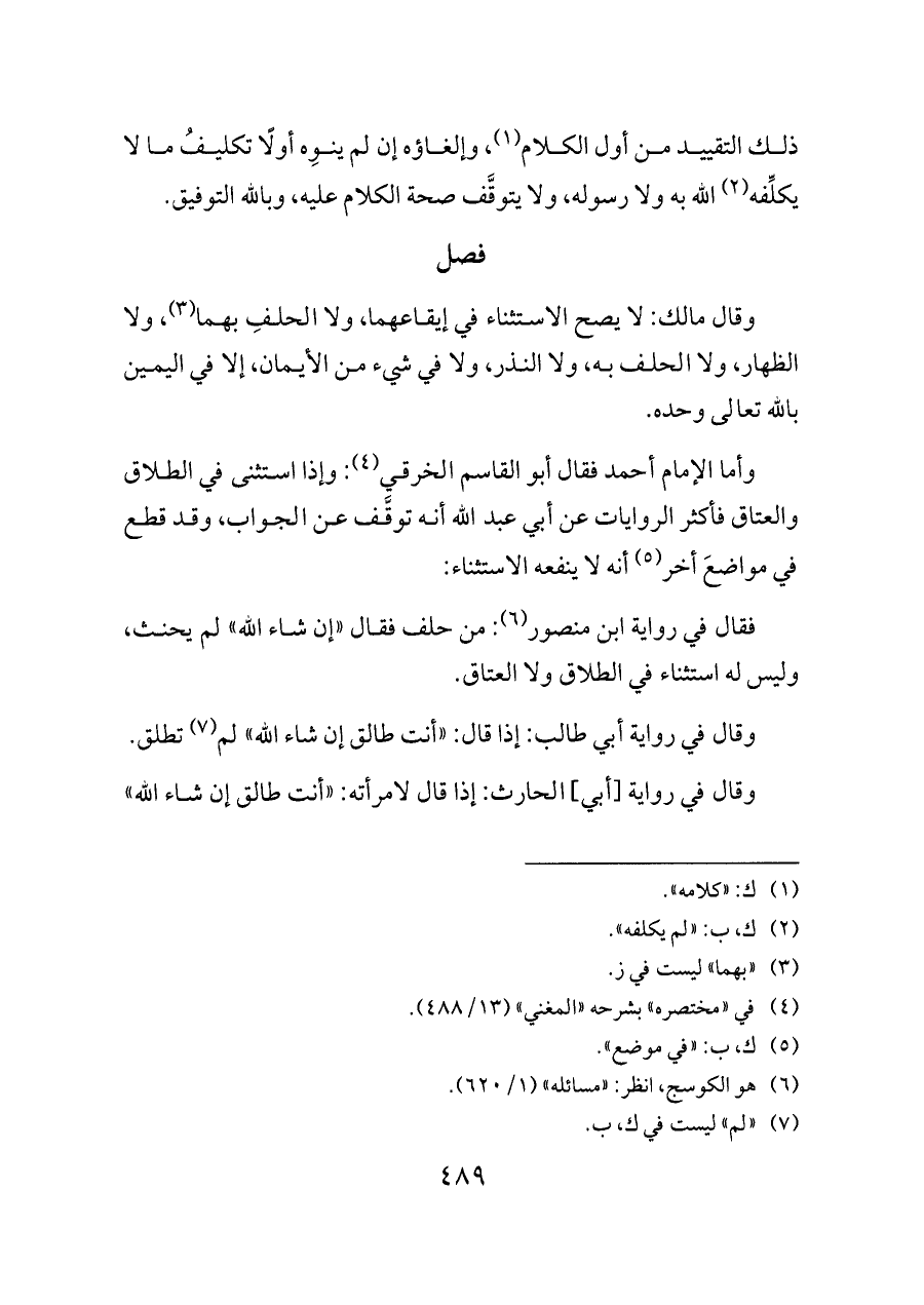 وأما الإمام أحمد فقال أبو القاسم الخرقي (¬٤): وإذا استثنى في الطلاق والعتاق فأكثر الروايات عن أبي عبد الله أنه توقَّف عن الجواب، وقد قطع في مواضعَ أخر (¬٥) أنه لا ينفعه الاستثناء: