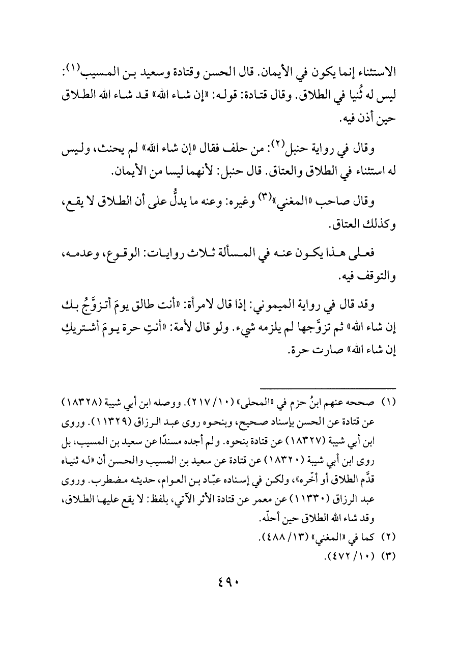 (¬١) صححه عنهم ابنُ حزم في «المحلى» (١٠/ ٢١٧). ووصله ابن أبي شيبة (١٨٣٢٨) عن قتادة عن الحسن بإسناد صحيح، وبنحوه روى عبد الرزاق (١١٣٢٩). وروى ابن أبي شيبة (١٨٣٢٧) عن قتادة بنحوه. ولم أجده مسندًا عن سعيد بن المسيب، بل روى ابن أبي شيبة (١٨٣٢٠) عن قتادة عن سعيد بن المسيب والحسن أن «له ثنياه قدَّم الطلاق أو أخّره»، ولكن في إسناده عبّاد بن العوام، حديثه مضطرب. وروى عبد الرزاق (١١٣٣٠) عن معمر عن قتادة الأثر الآتي، بلفظ: لا يقع عليها الطلاق، وقد شاء الله الطلاق حين أحلّه.
