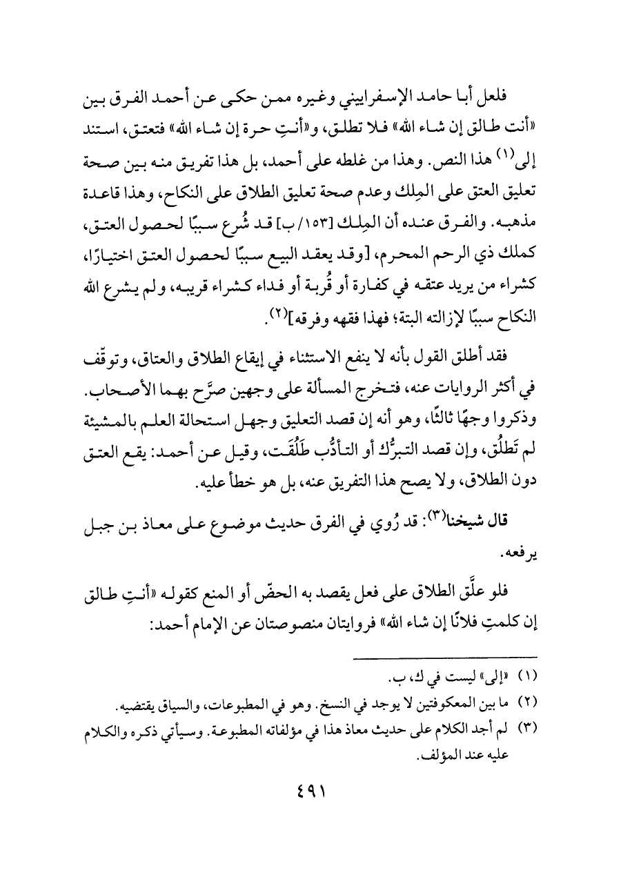 فلعل أبا حامد الإسفراييني وغيره ممن حكى عن أحمد الفرق بين «أنت طالق إن شاء الله» فلا تطلق، و «أنتِ حرة إن شاء الله» فتعتق، استند إلى (¬١) هذا النص. وهذا من غلطه على أحمد، بل هذا تفريق منه بين صحة تعليق العتق على المِلك وعدم صحة تعليق الطلاق على النكاح، وهذا قاعدة مذهبه. والفرق عنده أن المِلك [١٥٣/ب] قد شُرع سببًا لحصول العتق، كملك ذي الرحم المحرم، [وقد يعقد البيع سببًا لحصول العتق اختيارًا، كشراء من يريد عتقه في كفارة أو قُربة أو فداء كشراء قريبه، ولم يشرع الله النكاح سببًا لإزالته البتة؛ فهذا فقهه وفرقه] (¬٢).
