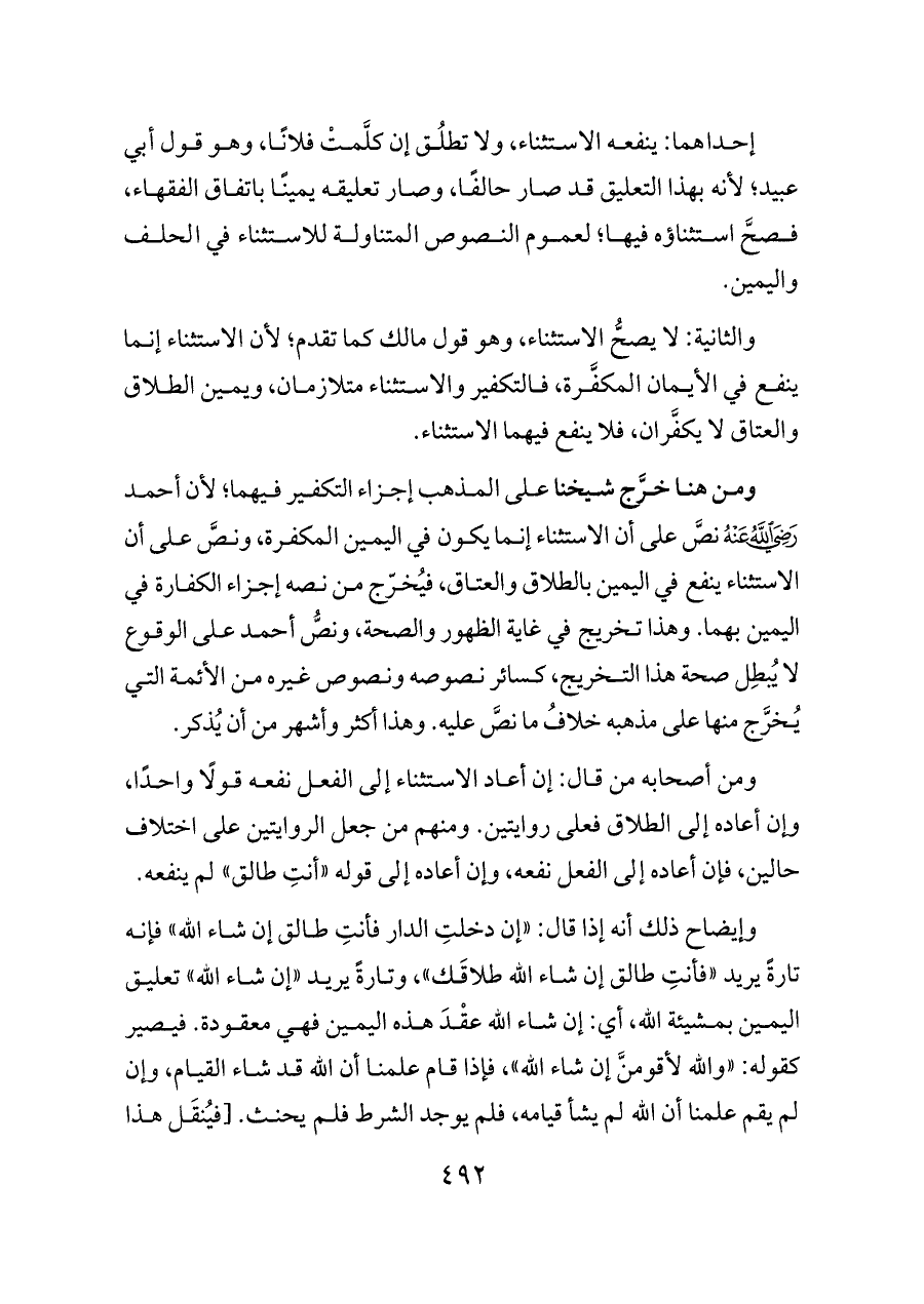 ومن أصحابه من قال: إن أعاد الاستثناء إلى الفعل نفعه قولًا واحدًا، وإن أعاده إلى الطلاق فعلى روايتين. ومنهم من جعل الروايتين على اختلاف حالين، فإن أعاده إلى الفعل نفعه، وإن أعاده إلى قوله «أنتِ طالق» لم ينفعه.