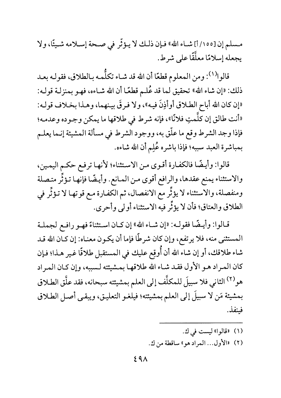 مسلم إن [١٥٥/أ] شاء الله» فإن ذلك لا يؤثّر في صحة إسلامه شيئًا، ولا يجعله إسلامًا معلَّقًا على شرط.