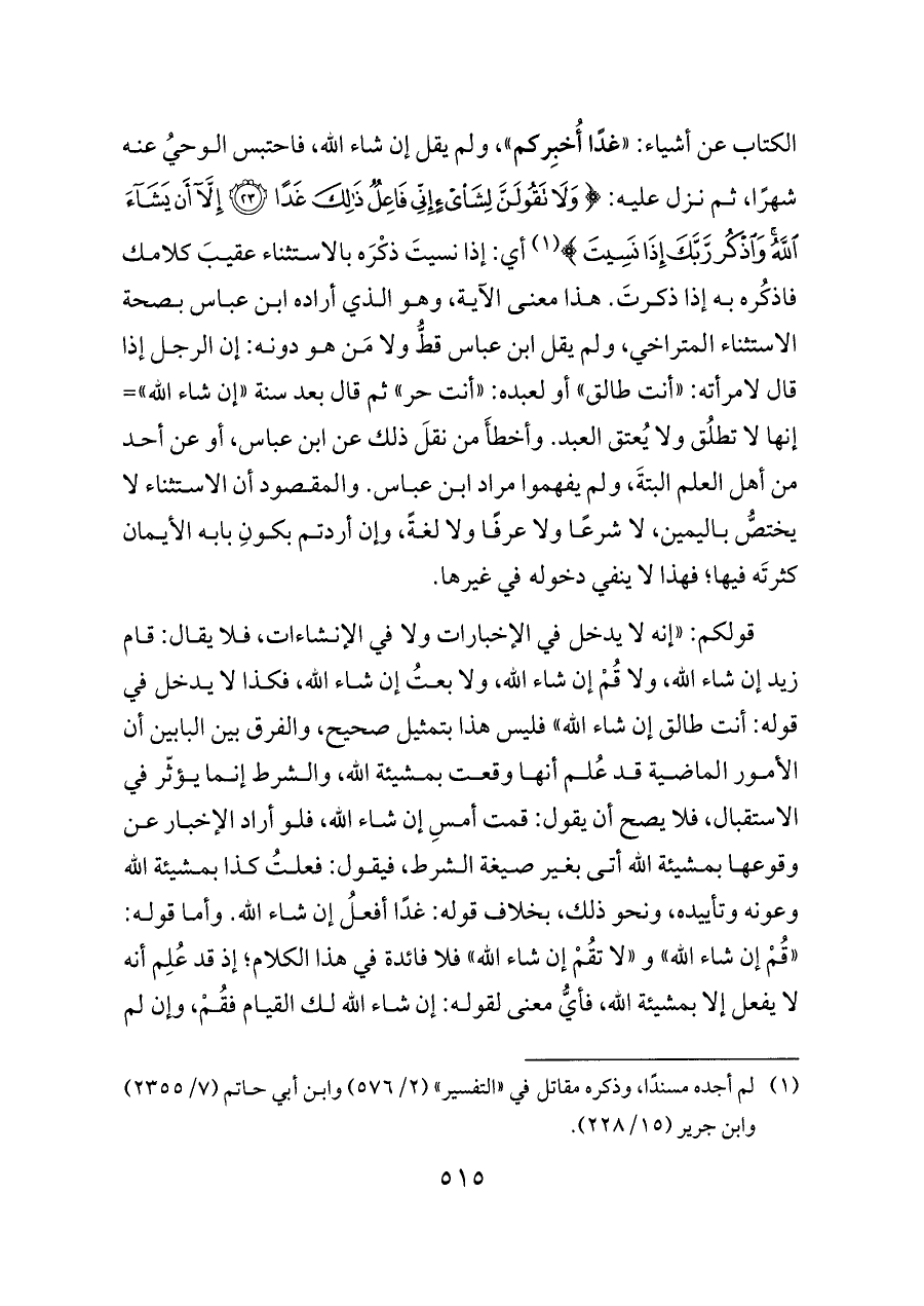 الكتاب عن أشياء: «غدًا أُخبِركم»، ولم يقل إن شاء الله، فاحتبس الوحيُ عنه شهرًا، ثم نزل عليه: {وَلَا تَقُولَنَّ لِشَيْءٍ إِنِّي فَاعِلٌ ذَلِكَ غَدًا (٢٣) إِلَّا أَنْ يَشَاءَ اللَّهُ وَاذْكُرْ رَبَّكَ إِذَا نَسِيتَ} (¬١) أي: إذا نسيتَ ذكْرَه بالاستثناء عقيبَ كلامك فاذكُره به إذا ذكرتَ. هذا معنى الآية، وهو الذي أراده ابن عباس بصحة الاستثناء المتراخي، ولم يقل ابن عباس قطُّ ولا مَن هو دونه: إن الرجل إذا قال لامرأته: «أنت طالق» أو لعبده: «أنت حر» ثم قال بعد سنة «إن شاء الله» = إنها لا تطلُق ولا يُعتق العبد. وأخطأَ من نقلَ ذلك عن ابن عباس، أو عن أحد من أهل العلم البتةَ، ولم يفهموا مراد ابن عباس. والمقصود أن الاستثناء لا يختصُّ باليمين، لا شرعًا ولا عرفًا ولا لغةً، وإن أردتم بكونِ بابه الأيمان كثرتَه فيها؛ فهذا لا ينفي دخوله في غيرها.