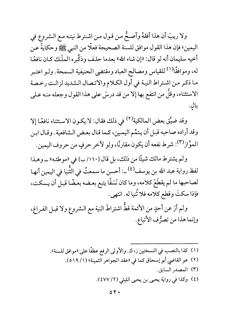 ولا ريبَ أن هذا أفقهُ وأصحُّ من قول من اشترط نيته مع الشروع في اليمين؛ فإن هذا القول موافق للسنة الصحيحة فعلًا من النبي - صلى الله عليه وسلم - وحكايةً عن أخيه سليمان أنه لو قال: «إن شاء الله» بعدما حلف وذكَّره الملَك كان نافعًا له، وموافقًا (¬١) للقياس ومصالح العباد ومقتضى الحنيفية السمحة. ولو اعتبر ما ذكر من اشتراط النية في أول الكلام والاتصال الشديد لزالت رخصة الاستثناء، وقلَّ من انتفع بها إلا من قد درسَ على هذا القول وجعله منه على بالٍ.