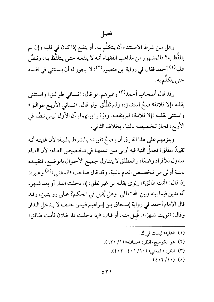 وهل من شرط الاستثناء أن يتكلَّم به، أو ينفع إذا كان في قلبه وإن لم يتلفَّظ به؟ فالمشهور من مذاهب الفقهاء أنه لا ينفعه حتى يتلفَّظ به، ونصَّ عليه (¬١) أحمد فقال في رواية ابن منصور (¬٢): لا يجوز له أن يستثني في نفسه حتى يتكلَّم به.