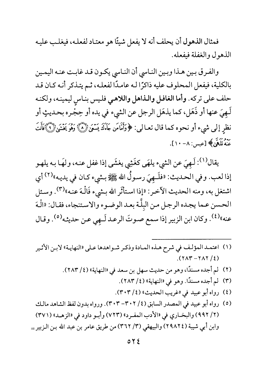 والفرق بين هذا وبين الناسي أن الناسي يكون قد غابت عنه اليمين بالكلية، فيفعل المحلوف عليه ذاكرًا له عامدًا لفعله، ثم يتذكر أنه كان قد حلف على تركه. وأما الغافل والذاهل واللاهي فليس بناسٍ ليمينه، ولكنه لَهِيَ عنها أو ذَهَل، كما يذهَل الرجل عن الشيء في يده أو حِجْره بحديثٍ أو نظرٍ إلى شيء أو نحوه كما قال تعالى: {وَأَمَّا مَنْ جَاءَكَ يَسْعَى (٨) وَهُوَ يَخْشَى (٩) فَأَنْتَ عَنْهُ تَلَهَّى} [عبس: ٨ - ١٠].