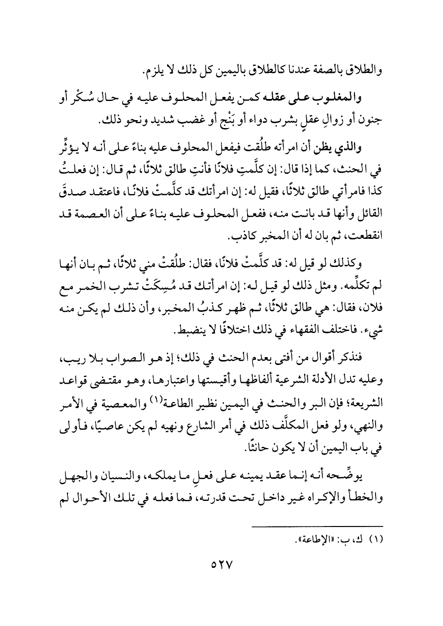 فنذكر أقوال من أفتى بعدم الحنث في ذلك؛ إذ هو الصواب بلا ريب، وعليه تدل الأدلة الشرعية ألفاظها وأقيستها واعتبارها، وهو مقتضى قواعد الشريعة؛ فإن البر والحنث في اليمين نظير الطاعة (¬١) والمعصية في الأمر والنهي، ولو فعل المكلَّف ذلك في أمر الشارع ونهيه لم يكن عاصيًا، فأولى في باب اليمين أن لا يكون حانثًا.
