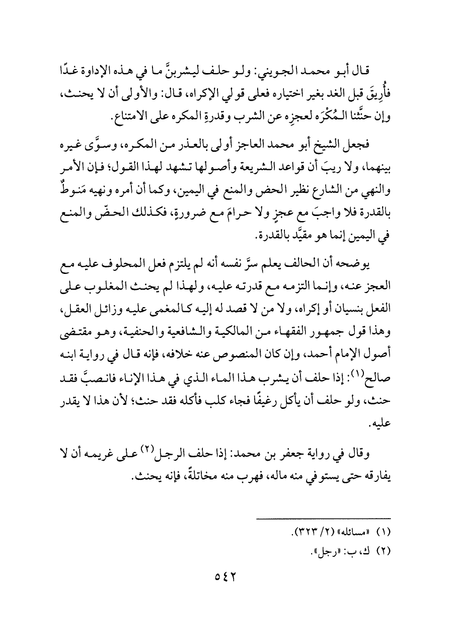 فجعل الشيخ أبو محمد العاجز أولى بالعذر من المكره، وسوَّى غيره بينهما، ولا ريبَ أن قواعد الشريعة وأصولها تشهد لهذا القول؛ فإن الأمر والنهي من الشارع نظير الحض والمنع في اليمين، وكما أن أمره ونهيه مَنوطٌ بالقدرة فلا واجبَ مع عجزٍ ولا حرامَ مع ضرورةٍ، فكذلك الحضّ والمنع في اليمين إنما هو مقيَّد بالقدرة.