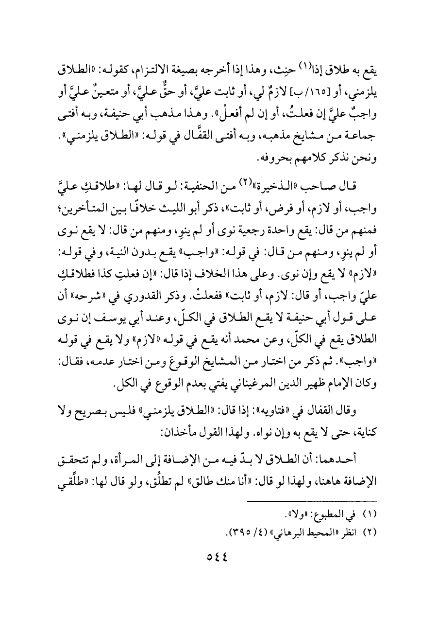 قال صاحب «الذخيرة» (¬٢) من الحنفية: لو قال لها: «طلاقكِ عليَّ واجب، أو لازم، أو فرض، أو ثابت»، ذكر أبو الليث خلافًا بين المتأخرين؛ فمنهم من قال: يقع واحدة رجعية نوى أو لم ينوِ، ومنهم من قال: لا يقع نوى أو لم ينوِ، ومنهم من قال: في قوله: «واجب» يقع بدون النية، وفي قوله: «لازم» لا يقع وإن نوى. وعلى هذا الخلاف إذا قال: «إن فعلتِ كذا فطلاقكِ عليّ واجب، أو قال: لازم، أو ثابت» ففعلتْ. وذكر القدوري في «شرحه» أن على قول أبي حنيفة لا يقع الطلاق في الكلّ، وعند أبي يوسف إن نوى الطلاق يقع في الكلّ، وعن محمد أنه يقع في قوله «لازم» ولا يقع في قوله «واجب». ثم ذكر من اختار من المشايخ الوقوعَ ومن اختار عدمه، فقال: وكان الإمام ظهير الدين المرغيناني يفتي بعدم الوقوع في الكل.