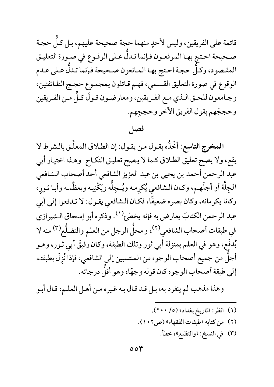 المخرج التاسع: أخْذُه بقول من يقول: إن الطلاق المعلَّق بالشرط لا يقع، ولا يصح تعليق الطلاق كما لا يصح تعليق النكاح. وهذا اختيار أبي عبد الرحمن أحمد بن يحيى بن عبد العزيز الشافعي أحد أصحاب الشافعي الجِلَّة أو أجلّهم، وكان الشافعي يُكرِمه ويُجِلُّه ويَكْنِيه ويعظِّمه وأبا ثورٍ، وكانا يكرمانه، وكان بصره ضعيفًا، فكان الشافعي يقول: لا تدفعوا إلى أبي عبد الرحمن الكتابَ يعارض به فإنه يخطئ (¬١). وذكره أبو إسحاق الشيرازي في طبقات أصحاب الشافعي (¬٢)، ومحلُّ الرجل من العلم والتضلُّع (¬٣) منه لا يُدفَع، وهو في العلم بمنزلة أبي ثور وتلك الطبقة، وكان رفيقَ أبي ثور، وهو أجلُّ من جميع أصحاب الوجوه من المنتسبين إلى الشافعي، فإذا نُزِلَ بطبقته إلى طبقة أصحاب الوجوه كان قوله وجهًا، وهو أقلُّ درجاته.
