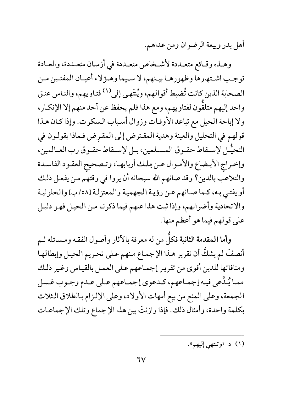 وأما المقدمة الثانية فكلُّ من له معرفة بالآثار وأصول الفقه ومسائله ثم أنصفَ لم يشكَّ أن تقرير هذا الإجماع منهم على تحريم الحيل وإبطالها ومنافاتها للدين أقوى من تقرير إجماعهم على العمل بالقياس وغير ذلك مما يُدَّعى فيه إجماعهم، كدعوى إجماعهم على عدم وجوب غسل الجمعة، وعلى المنع من بيع أمهات الأولاد، وعلى الإلزام بالطلاق الثلاث بكلمة واحدة، وأمثال ذلك. فإذا وازنتَ بين هذا الإجماع وتلك الإجماعات