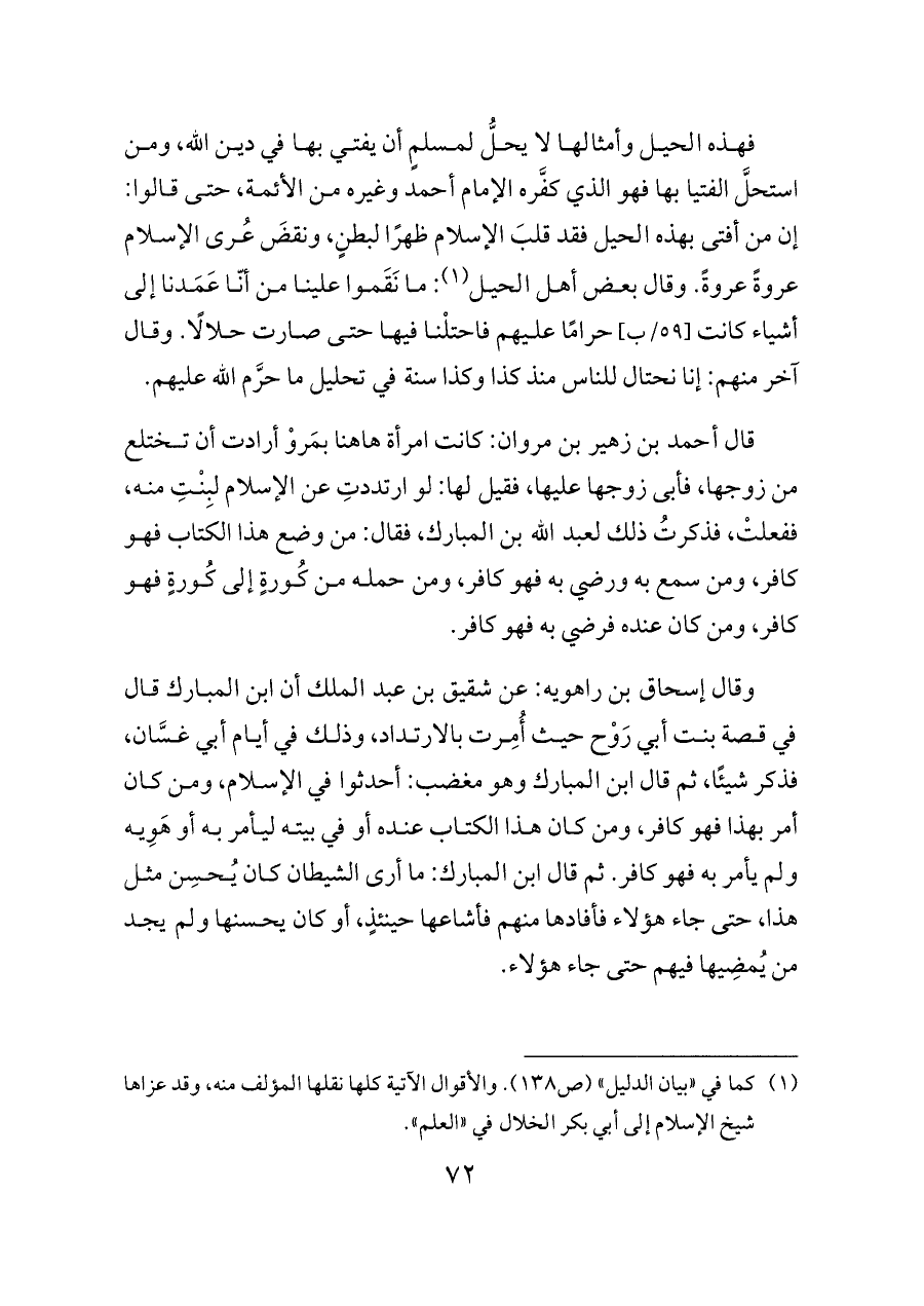 قال أحمد بن زهير بن مروان: كانت امرأة هاهنا بمَروْ أرادت أن تختلع من زوجها، فأبى زوجها عليها، فقيل لها: لو ارتددتِ عن الإسلام لبِنْتِ منه، ففعلتْ، فذكرتُ ذلك لعبد الله بن المبارك، فقال: من وضع هذا الكتاب فهو كافر، ومن سمع به ورضي به فهو كافر، ومن حمله من كُورةٍ إلى كُورةٍ فهو كافر، ومن كان عنده فرضي به فهو كافر.