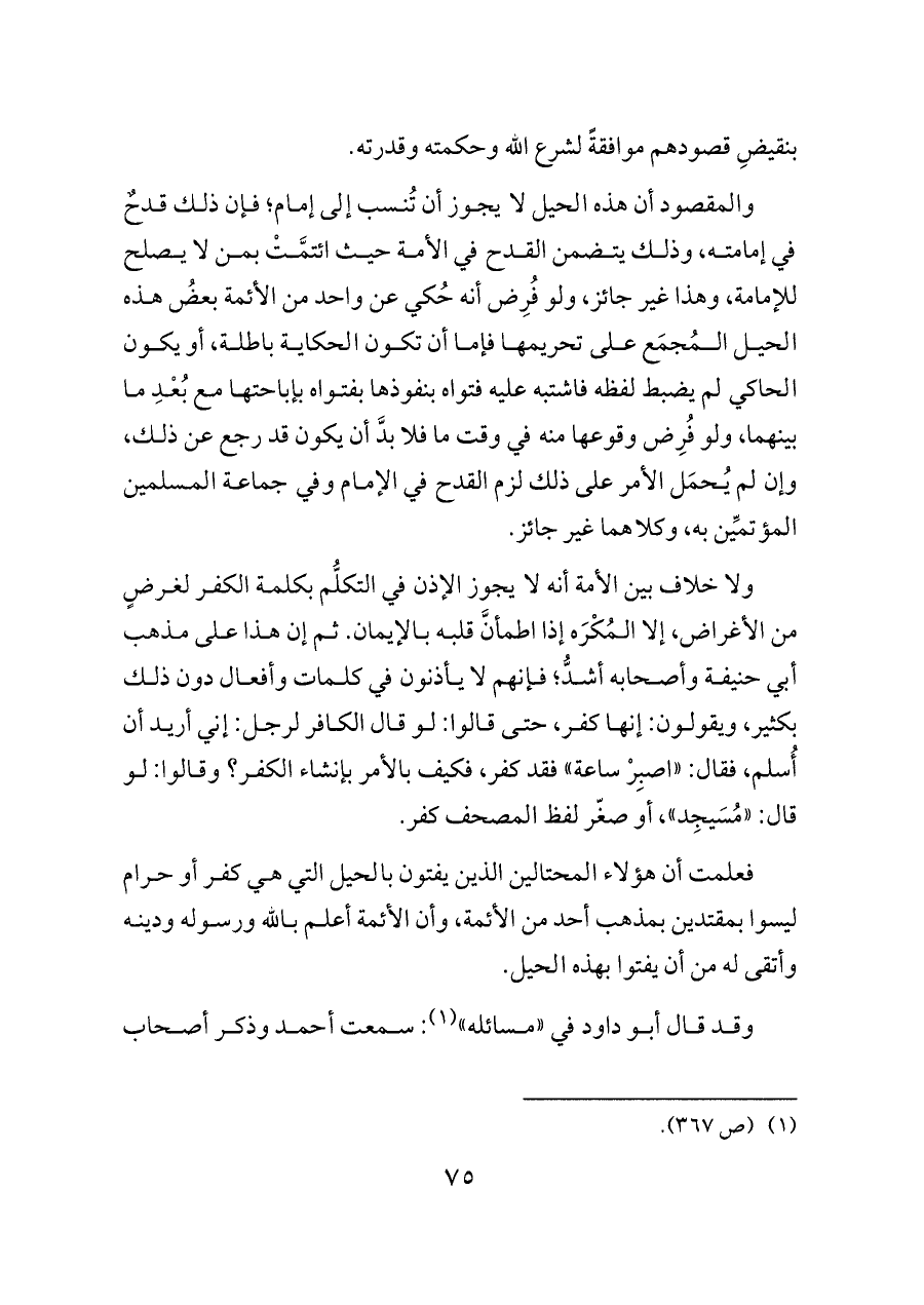 والمقصود أن هذه الحيل لا يجوز أن تُنسب إلى إمام؛ فإن ذلك قدحٌ في إمامته، وذلك يتضمن القدح في الأمة حيث ائتمَّتْ بمن لا يصلح للإمامة، وهذا غير جائز، ولو فُرِض أنه حُكي عن واحد من الأئمة بعضُ هذه الحيل المُجمَع على تحريمها فإما أن تكون الحكاية باطلة، أو يكون الحاكي لم يضبط لفظه فاشتبه عليه فتواه بنفوذها بفتواه بإباحتها مع بُعْدِ ما بينهما، ولو فُرِض وقوعها منه في وقت ما فلا بدَّ أن يكون قد رجع عن ذلك، وإن لم يُحمَل الأمر على ذلك لزم القدح في الإمام وفي جماعة المسلمين المؤتمِّين به، وكلاهما غير جائز.
