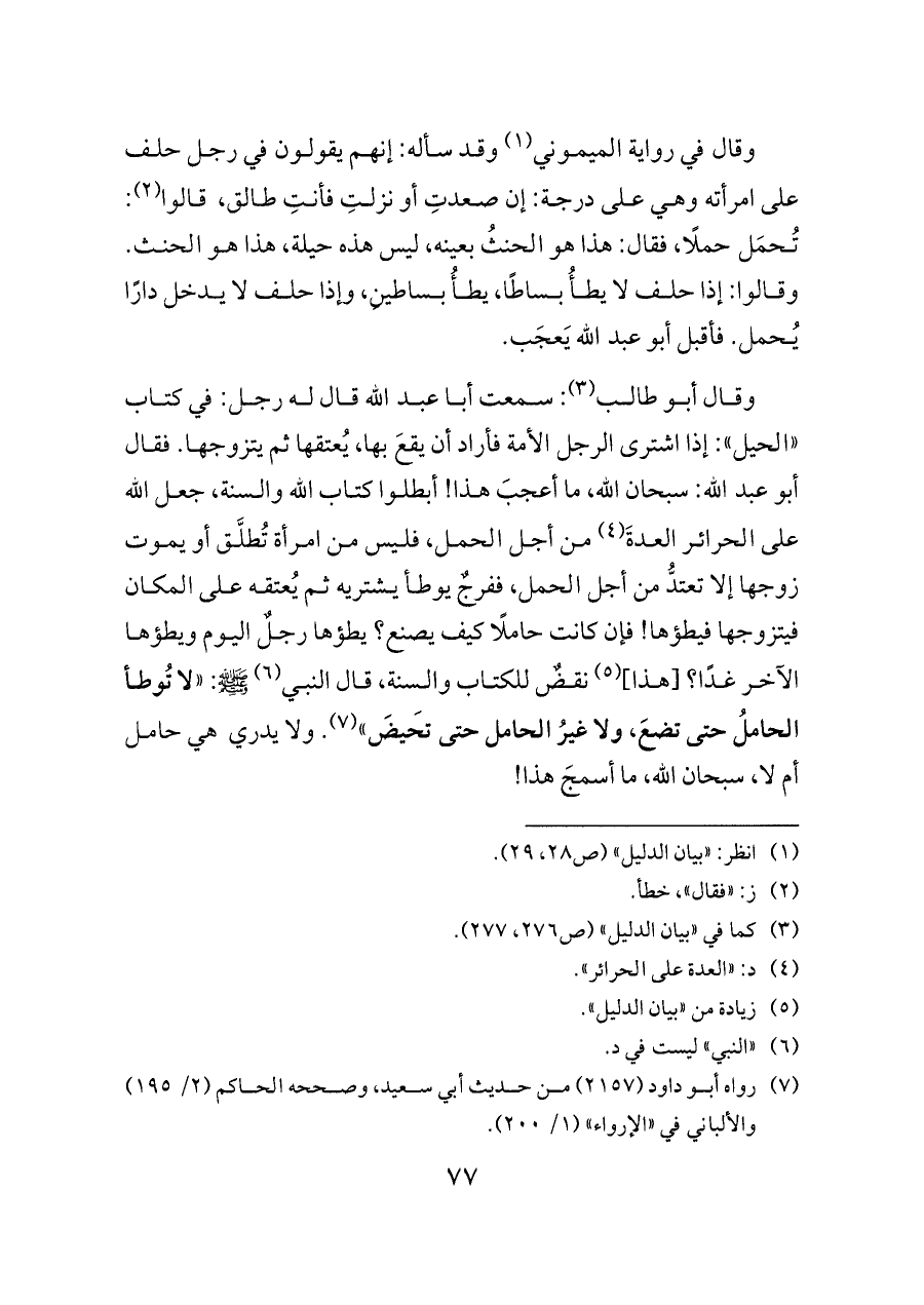 وقال أبو طالب (¬٣): سمعت أبا عبد الله قال له رجل: في كتاب «الحيل»: إذا اشترى الرجل الأمة فأراد أن يقعَ بها، يُعتقها ثم يتزوجها. فقال أبو عبد الله: سبحان الله، ما أعجبَ هذا! أبطلوا كتاب الله والسنة، جعل الله على الحرائر العدةَ (¬٤) من أجل الحمل، فليس من امرأة تُطلَّق أو يموت زوجها إلا تعتدُّ من أجل الحمل، ففرجٌ يوطأ يشتريه ثم يُعتقه على المكان فيتزوجها فيطؤها! فإن كانت حاملًا كيف يصنع؟ يطؤها رجلٌ اليوم ويطؤها الآخر غدًا؟ [هذا] (¬٥) نقضٌ للكتاب والسنة، قال النبي (¬٦) - صلى الله عليه وسلم -: «لا تُوطأ الحاملُ حتى تضعَ، ولا غيرُ الحامل حتى تَحيضَ» (¬٧). ولا يدري هي حامل أم لا، سبحان الله، ما أسمجَ هذا!
