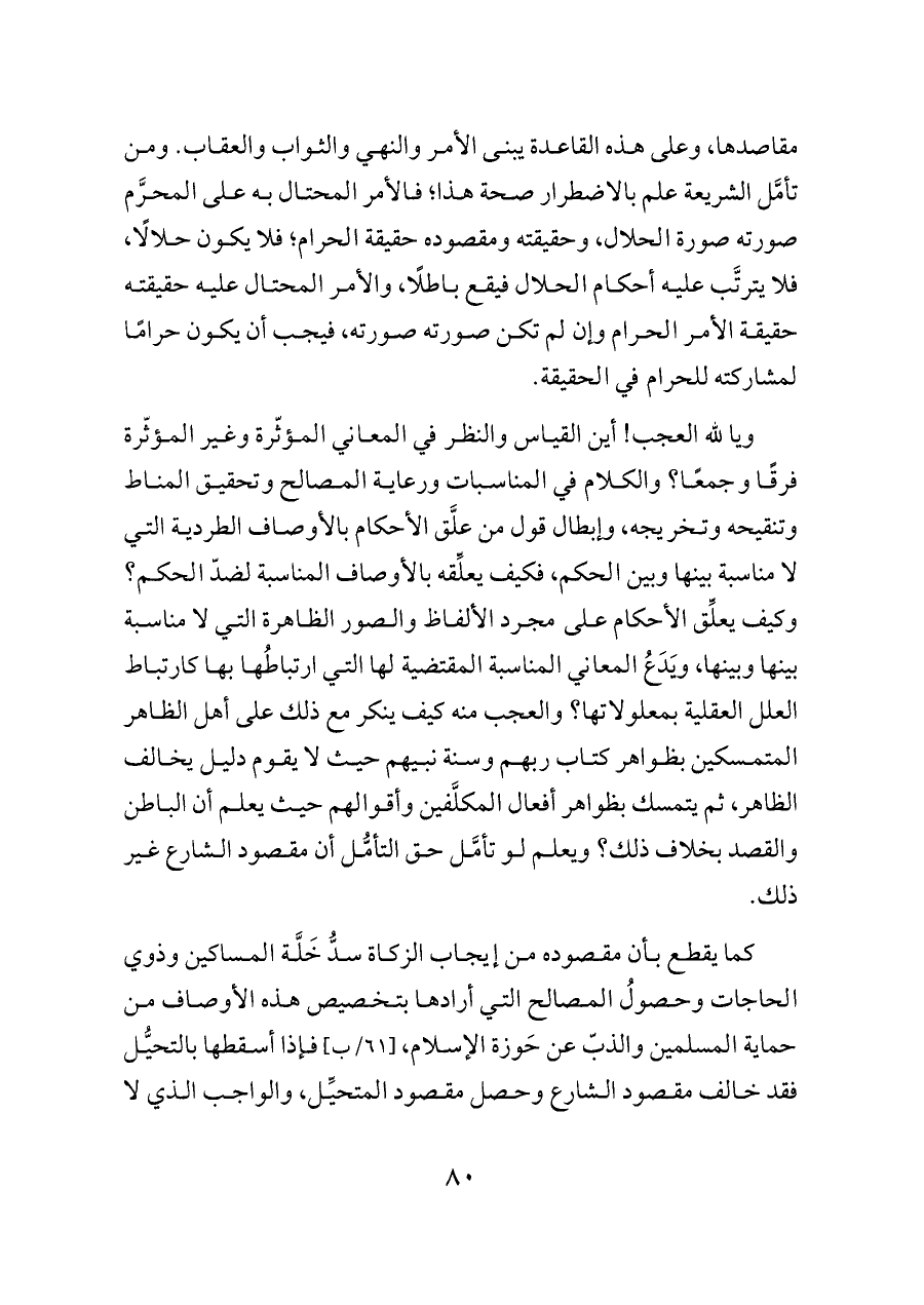 ويا لله العجب! أين القياس والنظر في المعاني المؤثّرة وغير المؤثّرة فرقًا وجمعًا؟ والكلام في المناسبات ورعاية المصالح وتحقيق المناط وتنقيحه وتخريجه، وإبطال قول من علَّق الأحكام بالأوصاف الطردية التي لا مناسبة بينها وبين الحكم، فكيف يعلِّقه بالأوصاف المناسبة لضدّ الحكم؟ وكيف يعلِّق الأحكام على مجرد الألفاظ والصور الظاهرة التي لا مناسبة بينها وبينها، ويَدَعُ المعاني المناسبة المقتضية لها التي ارتباطُها بها كارتباط العلل العقلية بمعلولاتها؟ والعجب منه كيف ينكر مع ذلك على أهل الظاهر المتمسكين بظواهر كتاب ربهم وسنة نبيهم حيث لا يقوم دليل يخالف الظاهر، ثم يتمسك بظواهر أفعال المكلَّفين وأقوالهم حيث يعلم أن الباطن والقصد بخلاف ذلك؟ ويعلم لو تأمَّل حق التأمُّل أن مقصود الشارع غير ذلك.