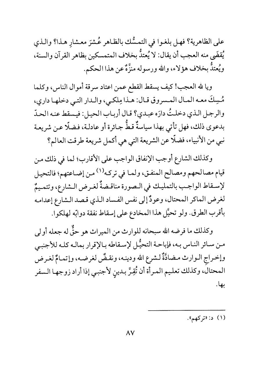 ويا لله العجب! كيف يسقط القطع عمن اعتاد سرقة أموال الناس، وكلما مُسِكَ معه المال المسروق قال: هذا مِلكي، والدار التي دخلها داري، والرجل الذي دخلتُ دارَه عبدي؟ قال أرباب الحيل: فيسقط عنه الحدّ بدعوى ذلك، فهل تأتي بهذا سياسةٌ قطُّ جائرة أو عادلة، فضلًا عن شريعة نبي من الأنبياء، فضلًا عن الشريعة التي هي أكمل شريعة طرقت العالم؟