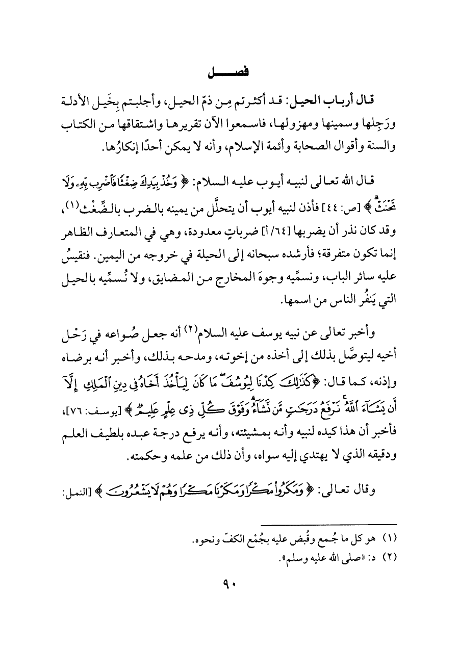 قال الله تعالى لنبيه أيوب عليه السلام: {وَخُذْ بِيَدِكَ ضِغْثًا فَاضْرِبْ بِهِ وَلَا تَحْنَثْ} [ص: ٤٤] فأذن لنبيه أيوب أن يتحلَّل من يمينه بالضرب بالضِّغْث (¬١)، وقد كان نذر أن يضربها [٦٤/أ] ضرباتٍ معدودة، وهي في المتعارف الظاهر إنما تكون متفرقة؛ فأرشده سبحانه إلى الحيلة في خروجه من اليمين. فنقيسُ عليه سائر الباب، ونسمِّيه وجوهَ المخارج من المضايق، ولا نُسمِّيه بالحيل التي يَنفُر الناس من اسمها.