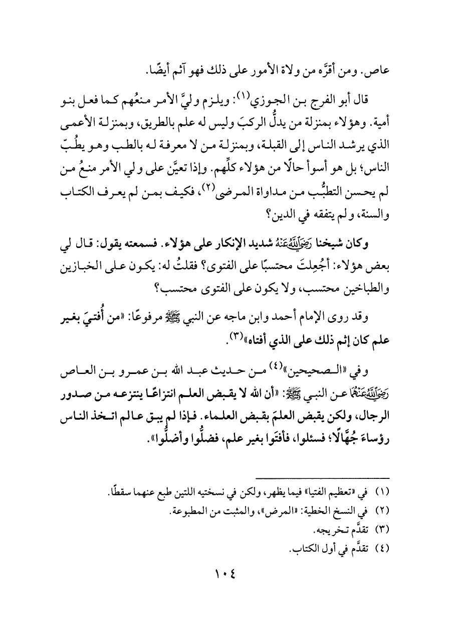 قال أبو الفرج بن الجوزي (¬١): ويلزم وليَّ الأمر منعُهم كما فعل بنو أمية. وهؤلاء بمنزلة من يدلُّ الركبَ وليس له علم بالطريق، وبمنزلة الأعمى الذي يرشد الناس إلى القبلة، وبمنزلة من لا معرفة له بالطب وهو يطُبّ الناس؛ بل هو أسوأ حالًا من هؤلاء كلِّهم. وإذا تعيَّن على ولي الأمر منعُ من لم يحسن التطبُّب من مداواة المرضى (¬٢)، فكيف بمن لم يعرف الكتاب والسنة، ولم يتفقه في الدين؟
