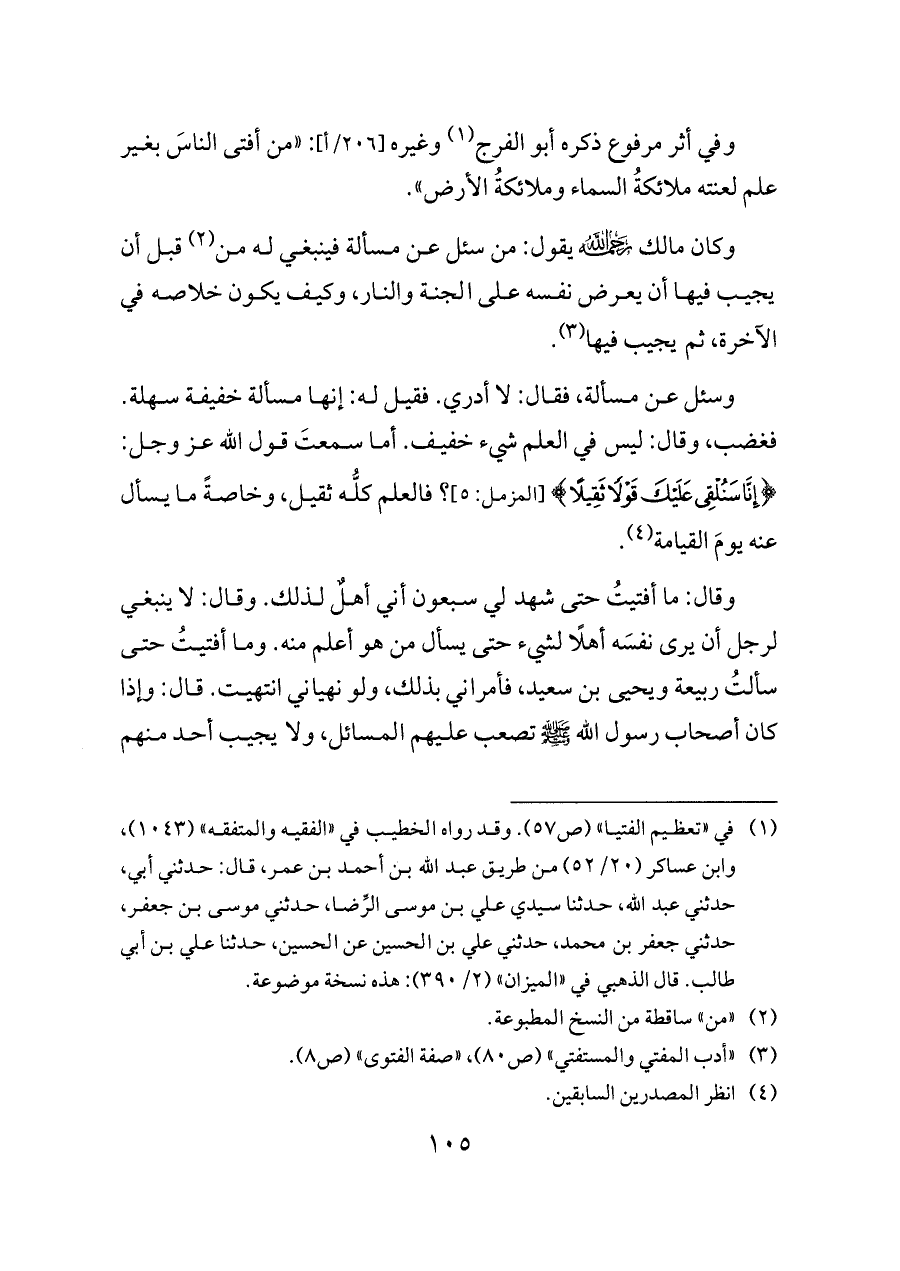 وفي أثر مرفوع ذكره أبو الفرج (¬١) وغيره [٢٠٦/أ]: «من أفتى الناسَ بغير علم لعنته ملائكةُ السماء وملائكةُ الأرض».