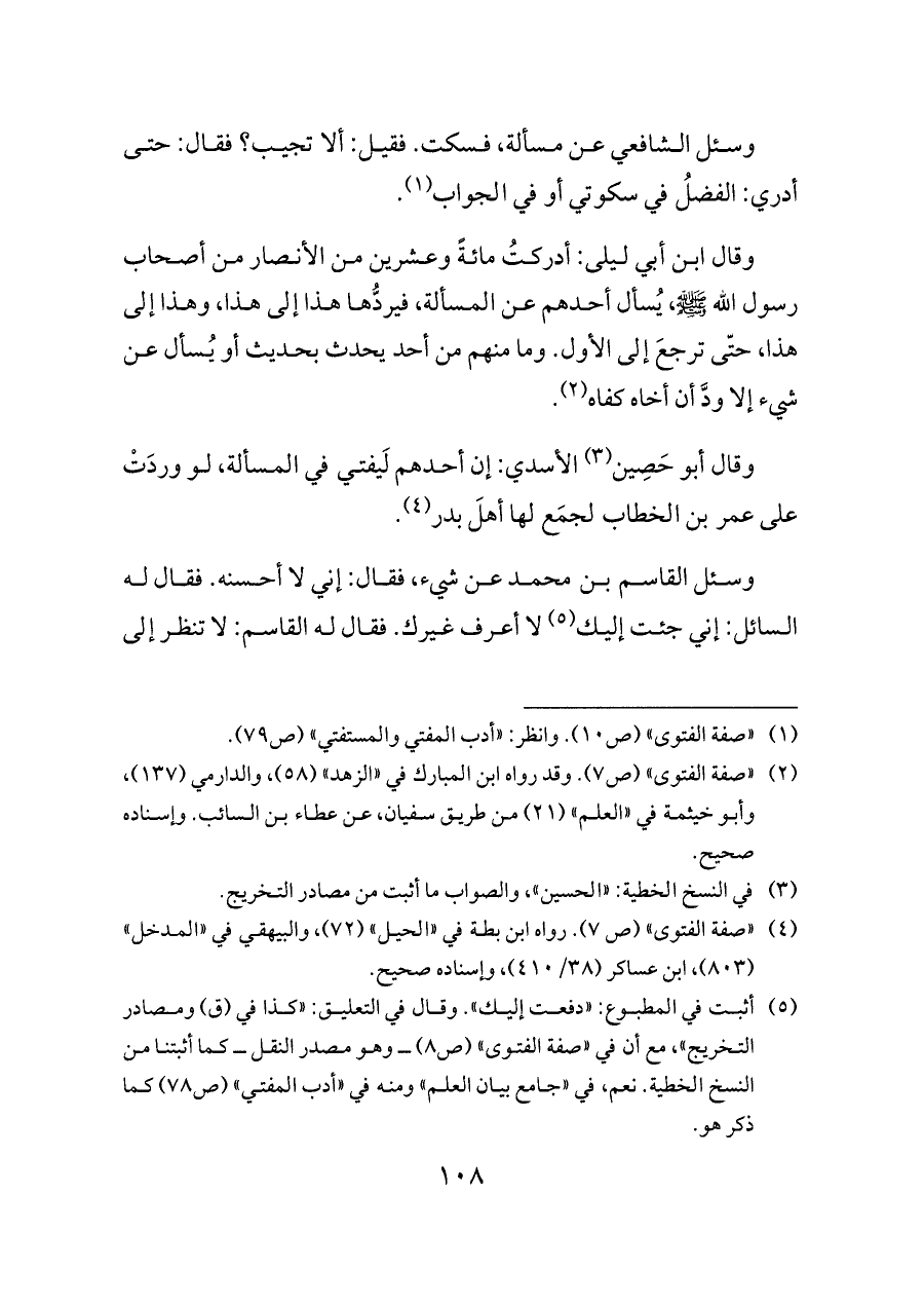 (¬٥) أثبت في المطبوع: «دفعت إليك». وقال في التعليق: «كذا في (ق) ومصادر التخريج»، مع أن في «صفة الفتوى» (ص ٨) ــ وهو مصدر النقل ــ كما أثبتنا من النسخ الخطية. نعم، في «جامع بيان العلم» ومنه في «أدب المفتي» (ص ٧٨) كما ذكر هو.