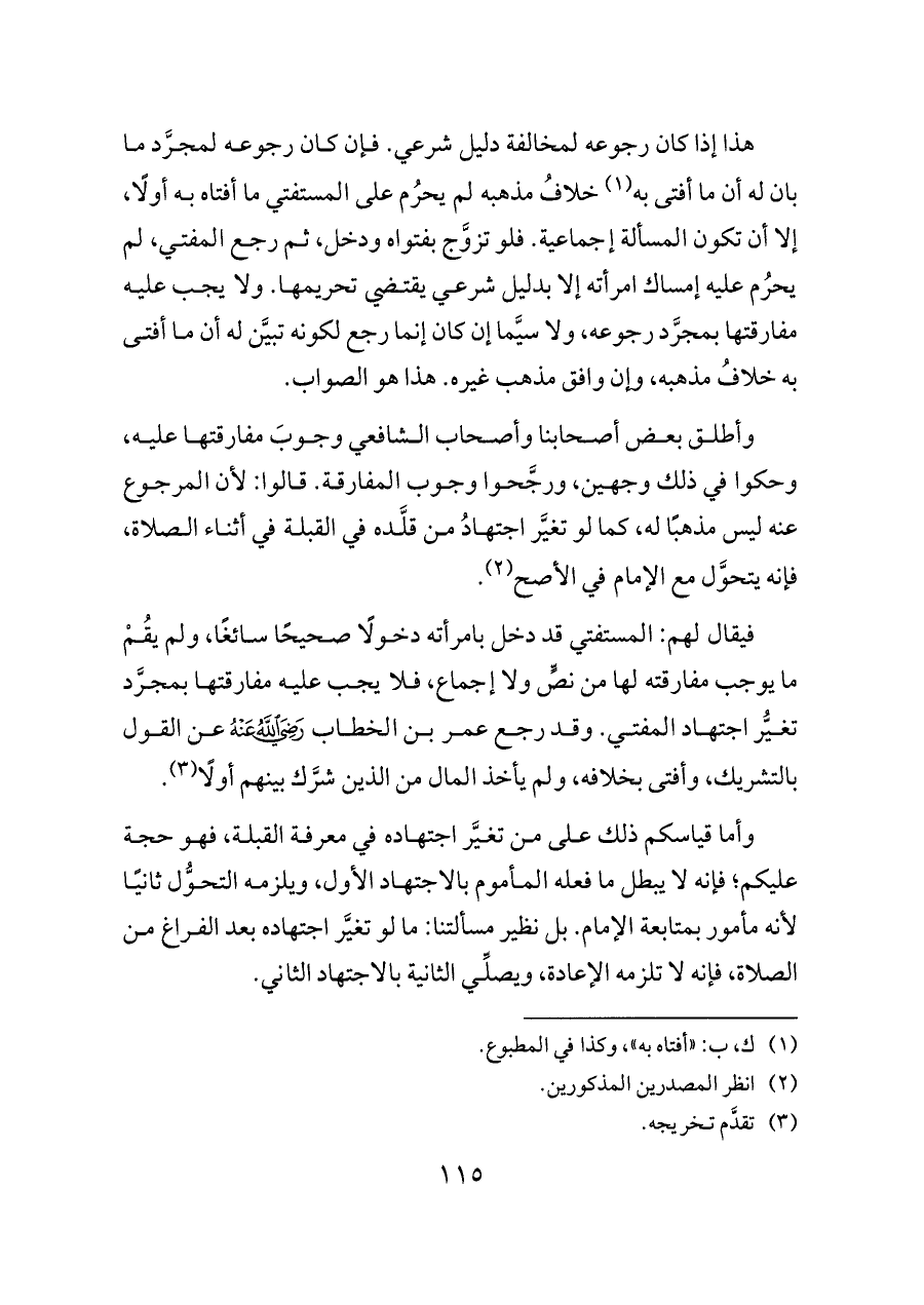 فيقال لهم: المستفتي قد دخل بامرأته دخولًا صحيحًا سائغًا، ولم يقُمْ ما يوجب مفارقته لها من نصٍّ ولا إجماع، فلا يجب عليه مفارقتها بمجرَّد تغيُّر اجتهاد المفتي. وقد رجع عمر بن الخطاب - رضي الله عنه - عن القول بالتشريك، وأفتى بخلافه، ولم يأخذ المال من الذين شرَّك بينهم أولًا (¬٣).