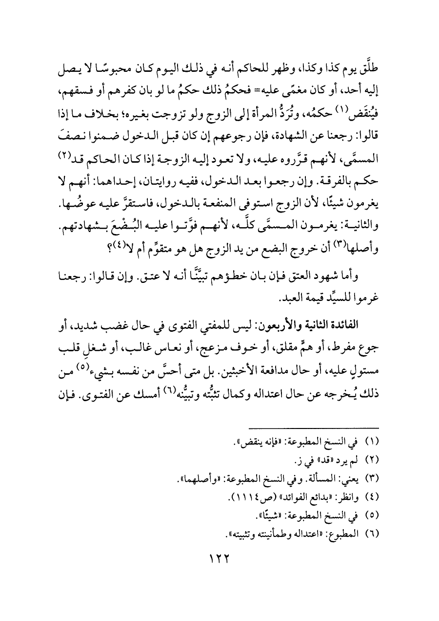 الفائدة الثانية والأربعون: ليس للمفتي الفتوى في حال غضب شديد، أو جوع مفرط، أو همٍّ مقلق، أو خوف مزعج، أو نعاس غالب، أو شغلِ قلب مستولٍ عليه، أو حال مدافعة الأخبثين. بل متى أحسَّ من نفسه بشيء (¬٥) من ذلك يُخرجه عن حال اعتداله وكمال تثبُّته وتبيُّنه (¬٦) أمسك عن الفتوى. فإن