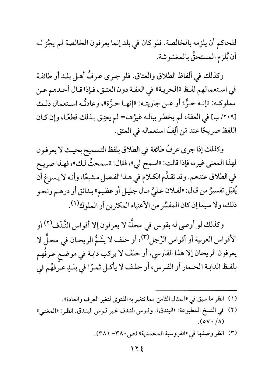 وكذلك إذا جرى عرفُ طائفة في الطلاق بلفظ التسميح بحيث لا يعرفون لهذا المعنى غيره، فإذا قالت: «اسمح لي»، فقال: «سمحتُ لك»، فهذا صريح في الطلاق عندهم. وقد تقدَّم الكلام في هذا الفصل مشبعًا، وأنه لا يسوغ أن يُقبَل تفسيرُ من قال: «لفلان عليَّ مال جليل أو عظيم» بدانق أو درهم ونحو ذلك، ولا سيما إن كان المفسِّر من الأغنياء المكثرين أو الملوك (¬١).