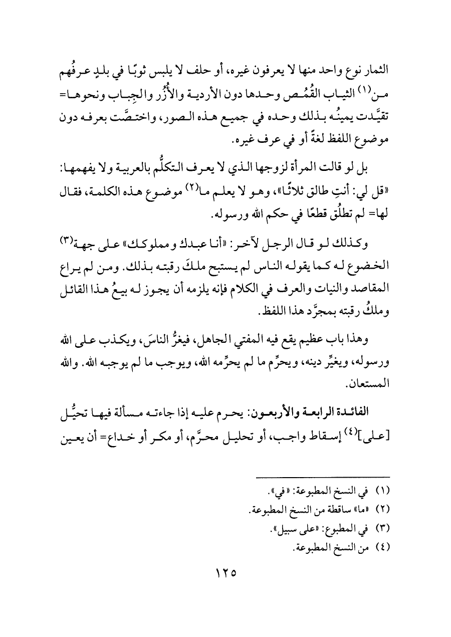 وهذا باب عظيم يقع فيه المفتي الجاهل، فيغرُّ الناسَ، ويكذب على الله ورسوله، ويغيِّر دينه، ويحرِّم ما لم يحرِّمه الله، ويوجب ما لم يوجبه الله. والله المستعان.