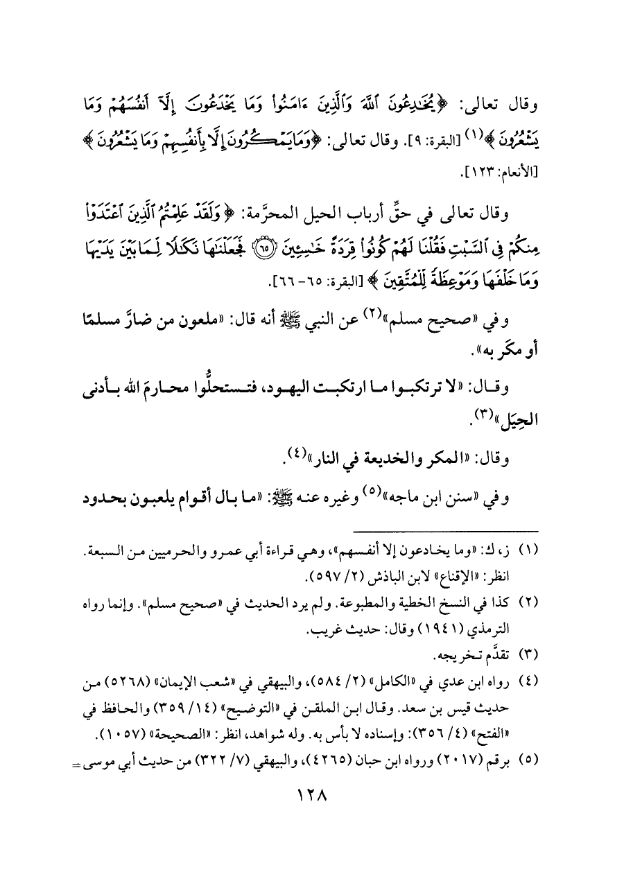 وفي «صحيح مسلم» (¬٢) عن النبي - صلى الله عليه وسلم - أنه قال: «ملعون من ضارَّ مسلمًا أو مكَر به».