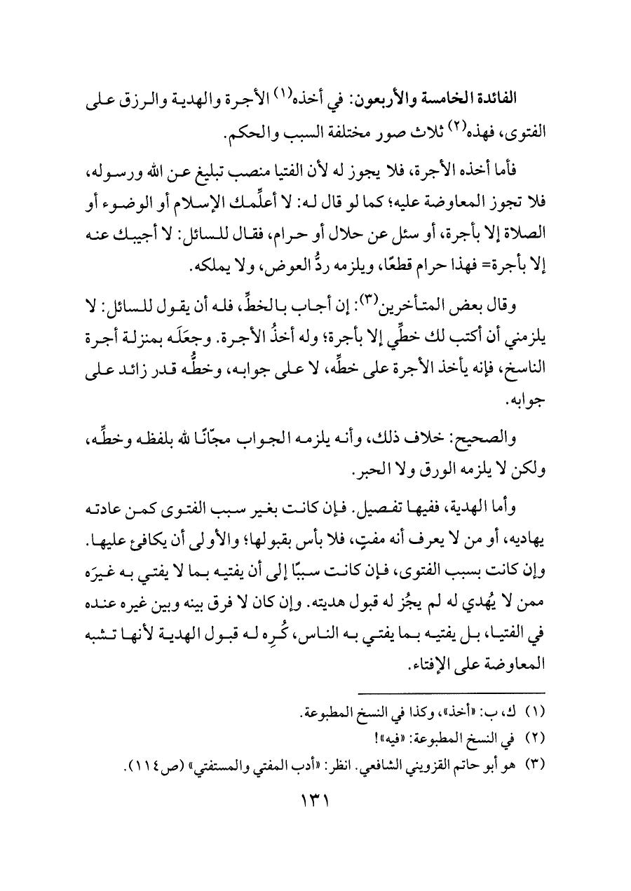 الفائدة الخامسة والأربعون: في أخذه (¬١) الأجرة والهدية والرزق على الفتوى، فهذه (¬٢) ثلاث صور مختلفة السبب والحكم.