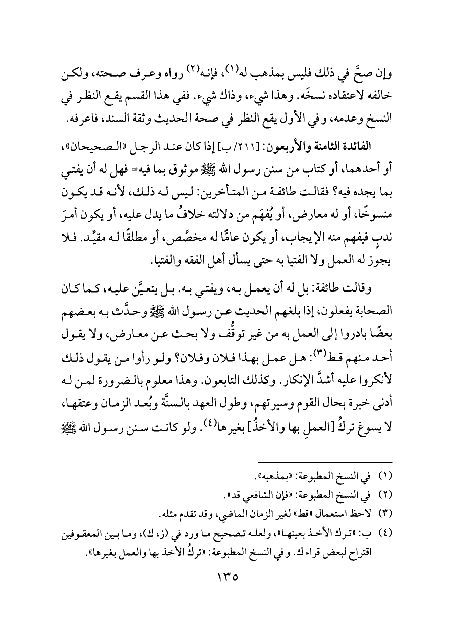 وإن صحَّ في ذلك فليس بمذهب له (¬١)، فإنه (¬٢) رواه وعرف صحته، ولكن خالفه لاعتقاده نسخَه. وهذا شيء، وذاك شيء. ففي هذا القسم يقع النظر في النسخ وعدمه، وفي الأول يقع النظر في صحة الحديث وثقة السند، فاعرفه.