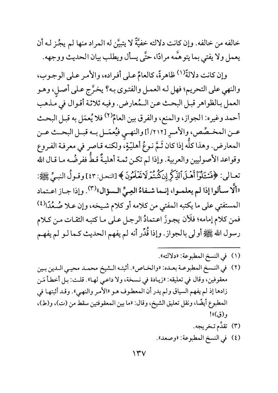 (¬٢) في النسخ المطبوعة بعده: «والخاص». أثبته الشيخ محمد محيي الدين بين معقوفين، وقال في تعليقه: «زيادة في نسخة، ولا داعي لها». قلت: بل أخطأ مَن زادها إذ لم يفهم السياق ولم يدر أن المعطوف هو «الأمر والنهي». وقد أثبتها في المطبوع أيضًا، ونقل تعليق الشيخ, وقال: «ما بين المعقوفتين سقط من (ت)، و (ط)، و (ق)»!