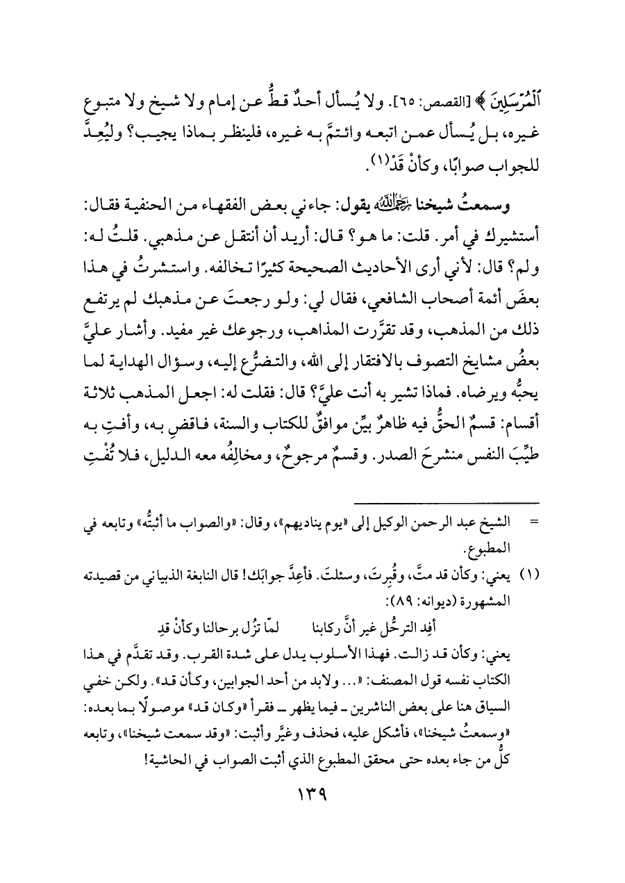 وسمعتُ شيخنا - رحمه الله - يقول: جاءني بعض الفقهاء من الحنفية فقال: أستشيرك في أمر. قلت: ما هو؟ قال: أريد أن أنتقل عن مذهبي. قلتُ له: ولم؟ قال: لأني أرى الأحاديث الصحيحة كثيرًا تخالفه. واستشرتُ في هذا بعضَ أئمة أصحاب الشافعي، فقال لي: ولو رجعتَ عن مذهبك لم يرتفع ذلك من المذهب، وقد تقرَّرت المذاهب، ورجوعك غير مفيد. وأشار عليَّ بعضُ مشايخ التصوف بالافتقار إلى الله، والتضرُّع إليه، وسؤال الهداية لما يحبُّه ويرضاه. فماذا تشير به أنت عليَّ؟ قال: فقلت له: اجعل المذهب ثلاثة أقسام: قسمٌ الحقُّ فيه ظاهرٌ بيِّن موافقٌ للكتاب والسنة، فاقضِ به، وأفتِ به طيِّبَ النفس منشرحَ الصدر. وقسمٌ مرجوحٌ، ومخالِفُه معه الدليل، فلا تُفْتِ