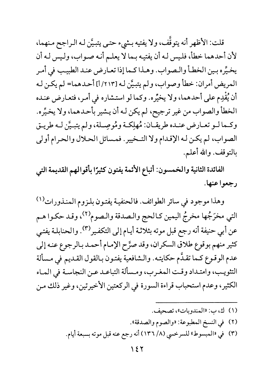 الفائدة الثانية والخمسون: أتباع الأئمة يفتون كثيرًا بأقوالهم القديمة التي رجعوا عنها.