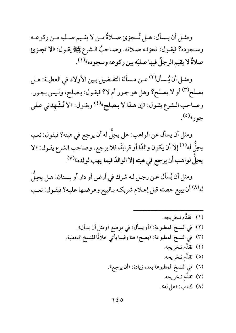 ومثل أن يسأل: هل تُجزئ صلاةُ من لا يقيم صلبه من ركوعه وسجوده؟ فيقول: تجزئه صلاته. وصاحبُ الشرع - صلى الله عليه وسلم - يقول: «لا تجزئ صلاةٌ لا يقيم الرجلُ فيها صلبَه بين ركوعه وسجوده» (¬١).