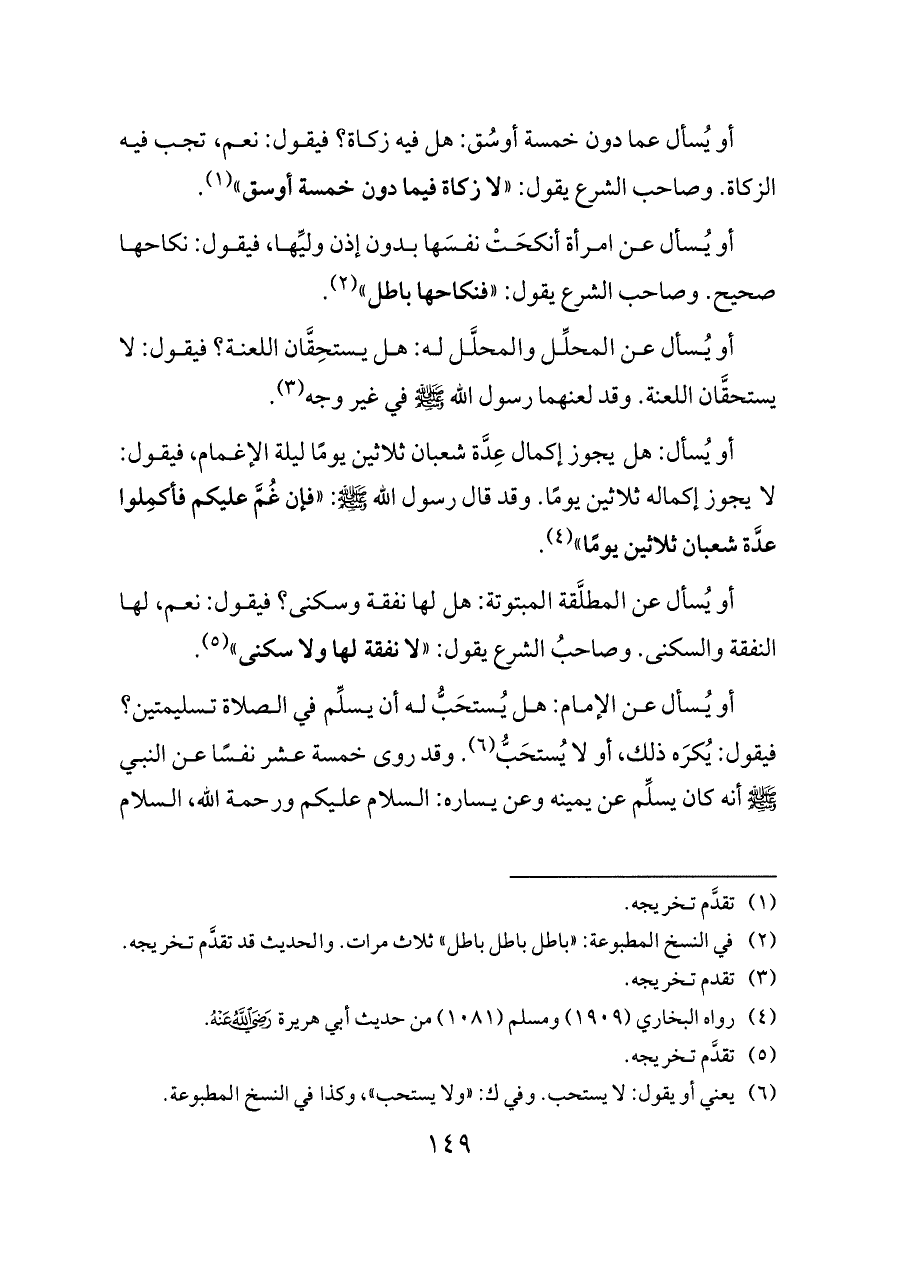 أو يُسأل عن المحلِّل والمحلَّل له: هل يستحِقَّان اللعنة؟ فيقول: لا يستحقَّان اللعنة. وقد لعنهما رسول الله - صلى الله عليه وسلم - في غير وجه (¬٣).