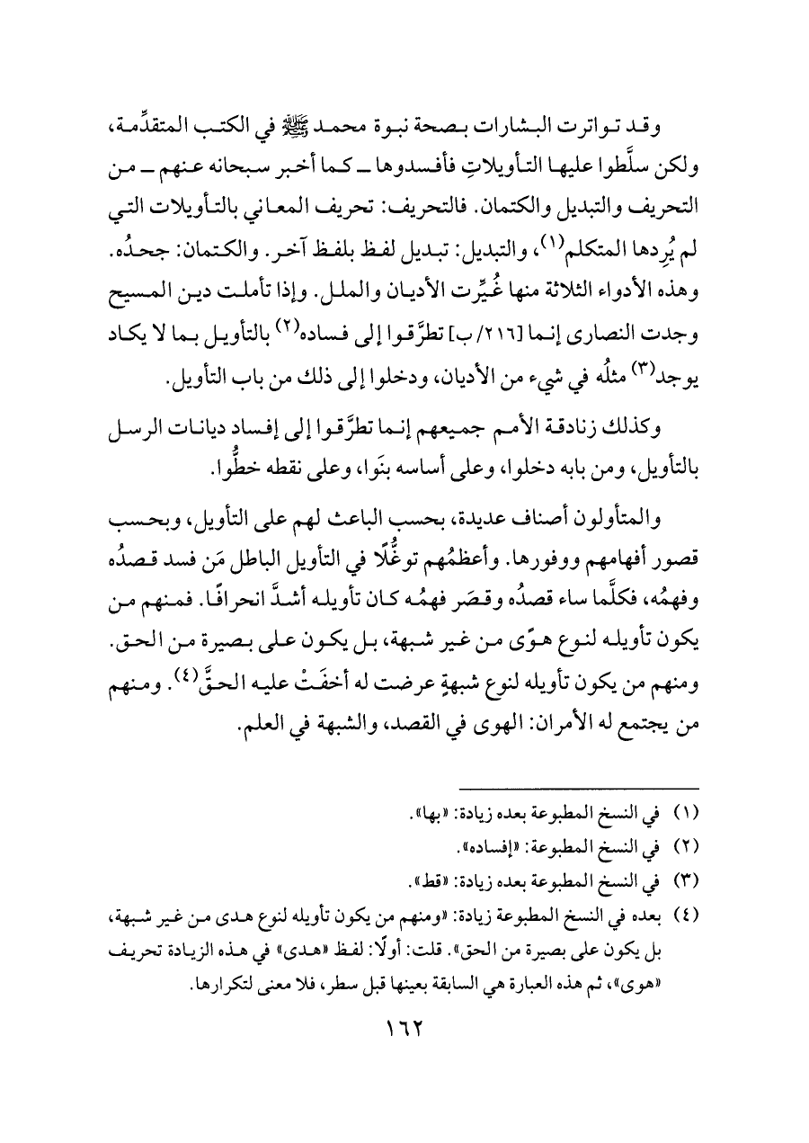 (¬٤) بعده في النسخ المطبوعة زيادة: «ومنهم من يكون تأويله لنوع هدى من غير شبهة، بل يكون على بصيرة من الحق». قلت: أولًا: لفظ «هدى» في هذه الزيادة تحريف «هوى»، ثم هذه العبارة هي السابقة بعينها قبل سطر، فلا معنى لتكرارها.