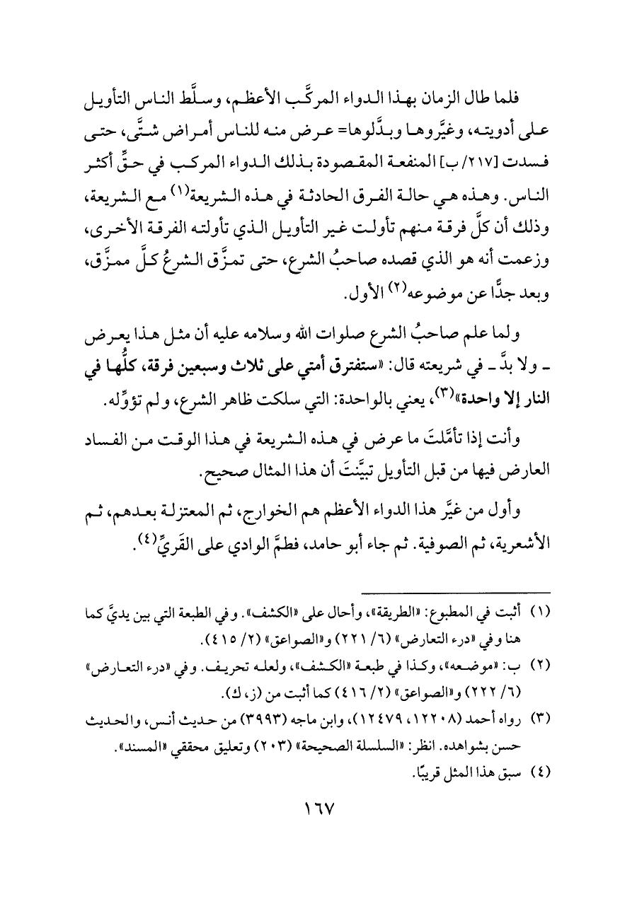 وأول من غيَّر هذا الدواء الأعظم هم الخوارج، ثم المعتزلة بعدهم، ثم الأشعرية، ثم الصوفية. ثم جاء أبو حامد، فطمَّ الوادي على القَريِّ (¬٤).