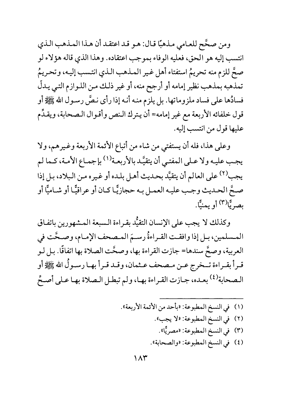 ومن صحَّح للعامي مذهبًا قال: هو قد اعتقد أن هذا المذهب الذي انتسب إليه هو الحق، فعليه الوفاء بموجب اعتقاده. وهذا الذي قاله هؤلاء لو صحَّ للزم منه تحريمُ استفتاء أهل غير المذهب الذي انتسب إليه، وتحريمُ تمذهبه بمذهب نظير إمامه أو أرجح منه، أو غير ذلك من اللوازم التي يدلّ فسادُها على فساد ملزوماتها. بل يلزم منه أنه إذا رأى نصَّ رسول الله - صلى الله عليه وسلم - أو قول خلفائه الأربعة مع غير إمامه= أن يترك النص وأقوال الصحابة، ويقدِّم عليها قول من انتسب إليه.