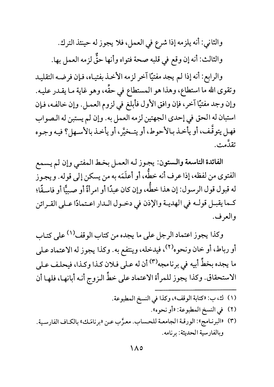 الفائدة التاسعة والستون: يجوز له العمل بخط المفتي وإن لم يسمع الفتوى من لفظه، إذا عرف أنه خطُّه، أو أعلَمَه به من يسكن إلى قوله. ويجوز له قبول قول الرسول: إن هذا خطُّه، وإن كان عبدًا أو امرأةً أو صبيًّا أو فاسقًا؛ كما يقبل قوله في الهدية والإذن في دخول الدار اعتمادًا على القرائن والعرف.