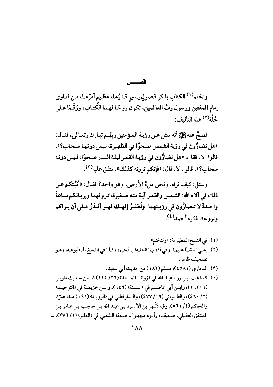 فصحَّ عنه - صلى الله عليه وسلم - أنه سئل عن رؤية المؤمنين ربَّهم تبارك وتعالى، فقال: «هل تضارُّون في رؤية الشمس صحوًا في الظهيرة، ليس دونها سحاب؟». قالوا: لا. فقال: «هل تضارُّون في رؤية القمر ليلة البدر صحوًا، ليس دونه سحاب؟». قالوا: لا. قال: «فإنكم ترونه كذلك». متفق عليه (¬٣).